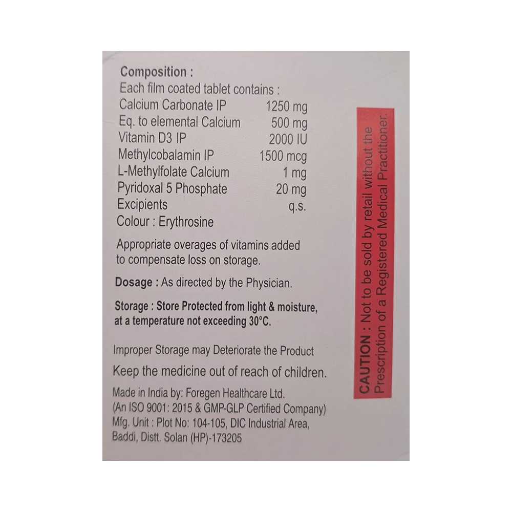 Salt Composition: Calcium Carbonate (1250mg) + Vitamin D3 (2000IU) + Methylcobalamin (1500mcg) + L-Methyl Folate Calcium (1mg) + Pyridoxal-5-phosphate (20mg)