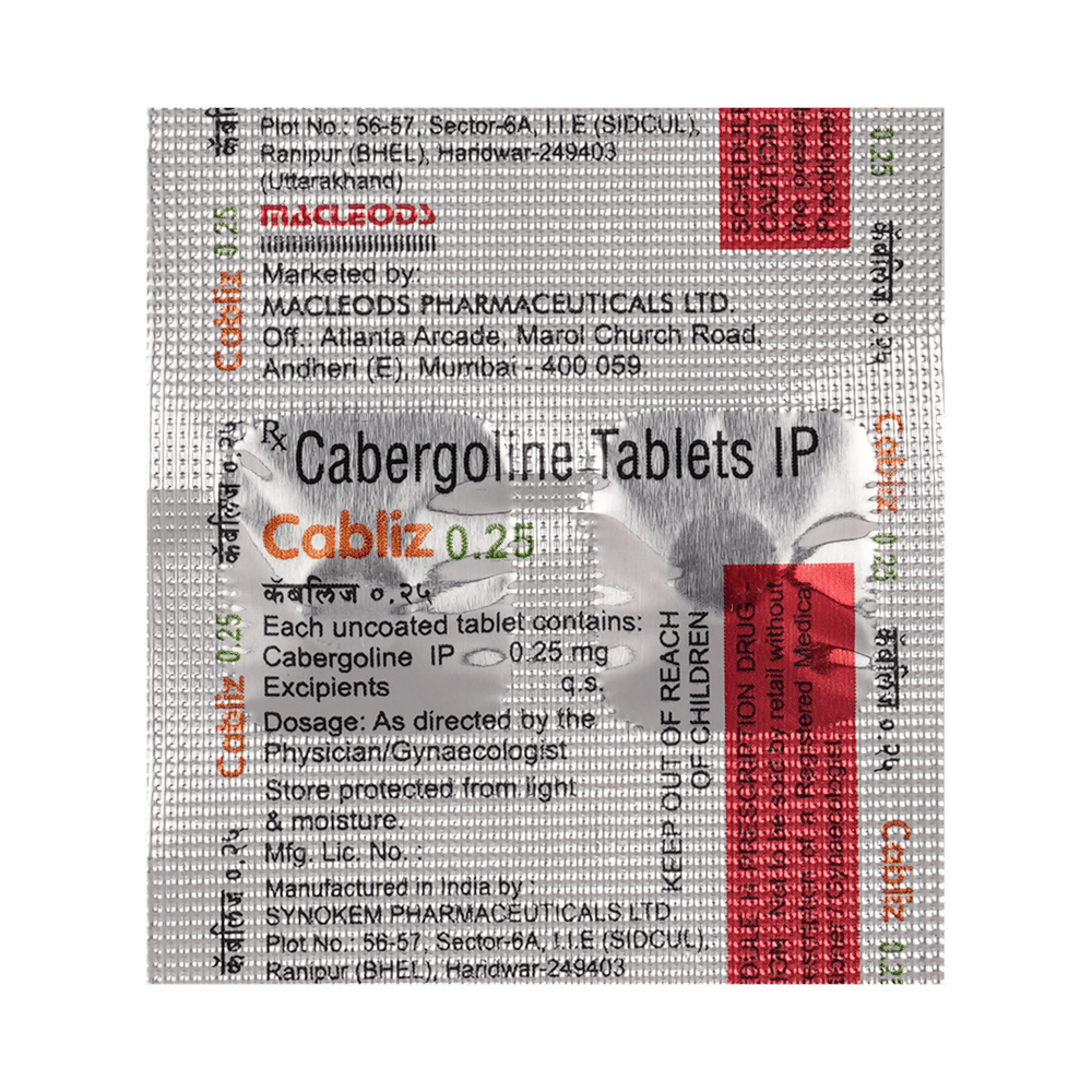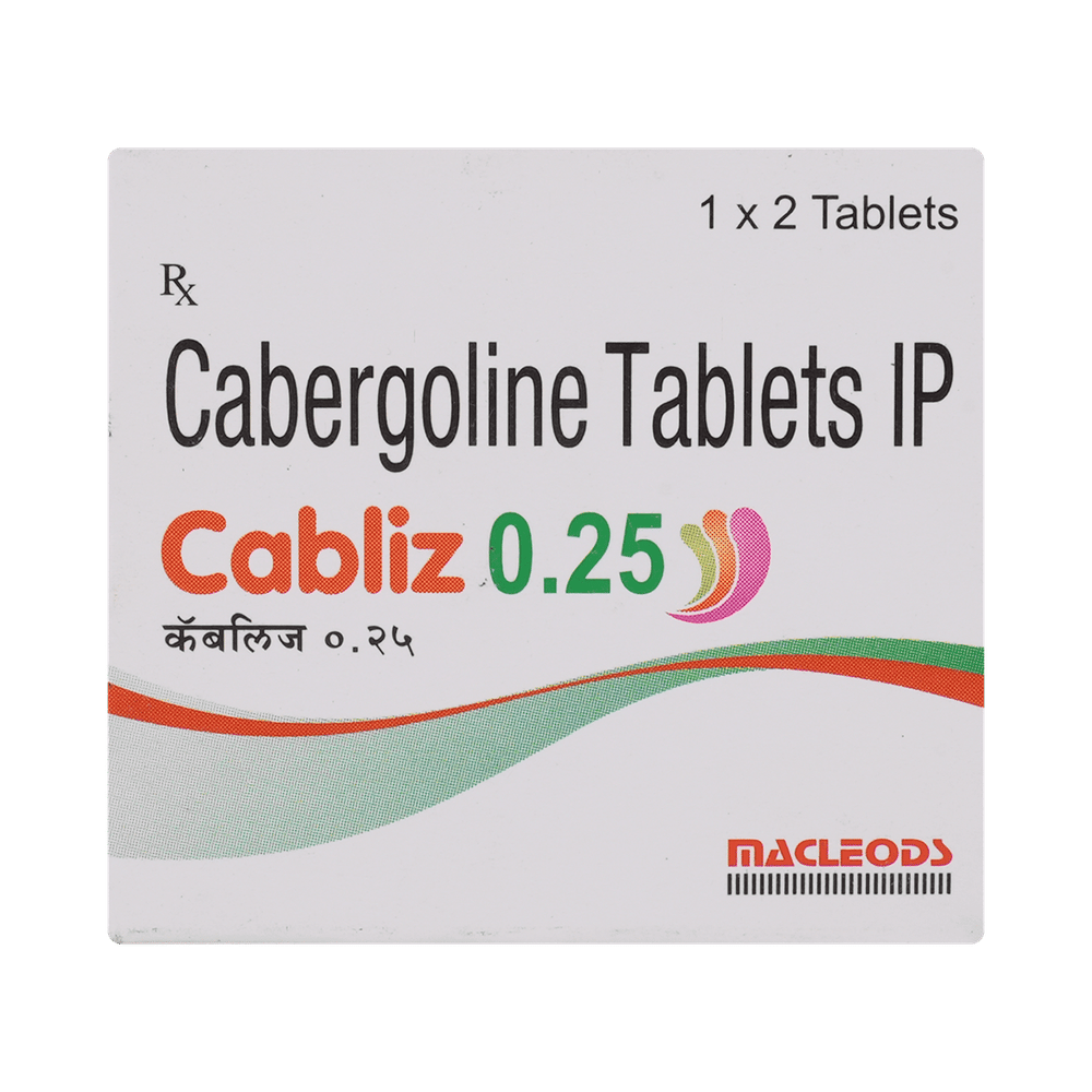 Cabliz 0.25mg Tablet is used for the treatment of a high level of prolactin. It is also helpful in stopping breast milk production in cases of stillbirth, abortion, or miscarriage. Cabliz 0.25mg Tablet can be taken with or without food, but take it at the same time to get the most benefit. It should be taken as your doctor's advice. The dose and how often you take it depend on what you take it for. Your doctor will decide how much you need to improve your symptoms. You should take this medicine for as long as it is prescribed for you.The most common side effects of this medicine include nausea, headache, fatigue, depression, dizziness, and low blood pressure. If these bother you or appear serious, let your doctor know. There may be ways of reducing or preventing them. Dizziness may occur after using Cabliz 0.25mg Tablet; avoid driving or rising suddenly from a sitting or lying position.Before taking this medicine, tell your doctor if you have ever had high blood pressure after birth or had heart disease. Tell your doctor if you are pregnant, planning pregnancy, or breastfeeding. Your doctor should also know about all other medicines you are taking, as many of these may make this medicine less effective or change how it works. Your doctor may check your blood pressure regularly while you are taking this medicine.