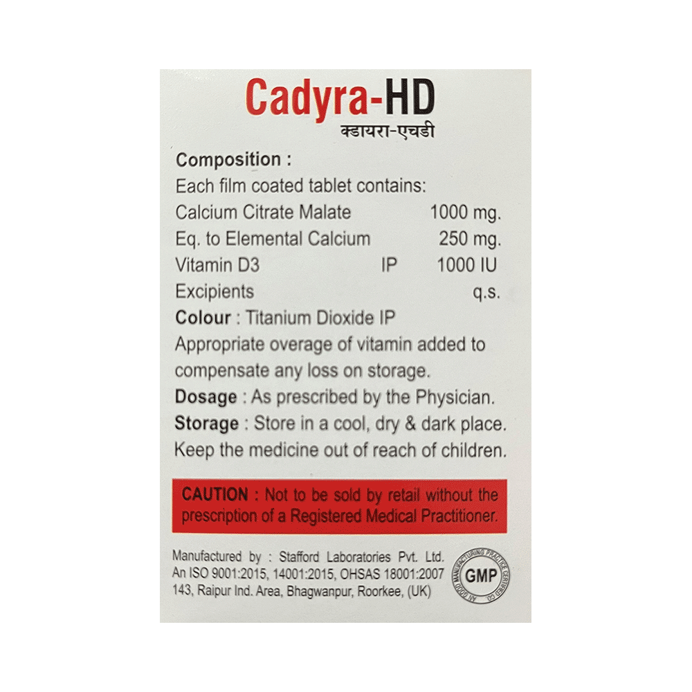 Cadyra-HD Tablet is a combination of two nutritional supplements: calcium and vitamin D3. Calcium is added as a dietary supplement when the amount of calcium taken in the diet is not enough. Vitamin D3 is a form of vitamin D. It raises vitamin D levels in your blood. This, in turn, raises calcium levels in your blood by helping you absorb more calcium from food.