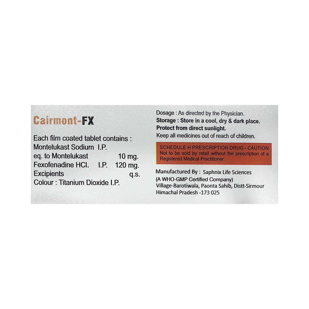 Cairmont-FX Tablet is a combination medicine used in the treatment of allergy symptoms such as runny nose, stuffy nose, sneezing, watery eyes, and congestion or stuffiness. Cairmont-FX Tablet is taken with or without food in a dose and duration as advised by the doctor. The dose you are given will depend on your condition and how you respond to the medicine. You should keep taking this medicine for as long as your doctor recommends. If you stop treatment too early your symptoms may come back and your condition may worsen. Let your healthcare team know about all other medications you are taking as some may affect, or be affected by this medicine.The most common side effects include nausea, diarrhea, vomiting, skin rash, flu-like symptoms, and headache. Most of these are temporary and usually resolve with time. Contact your doctor straight away if you are at all concerned about any of these side effects. This medicine may cause dizziness and sleepiness, so do not drive or do anything that requires mental focus until you know how this medicine affects you. Avoid drinking alcohol while taking this medicine as it can worsen your sleepiness.Never support self-medication or recommend your medicine to another person. It is beneficial to have plenty of fluids while taking this medication. Before you start taking this medicine it is important to inform your doctor if you are suffering from liver or kidney disease. You should also tell your doctor if you are pregnant, planning pregnancy or breastfeeding.