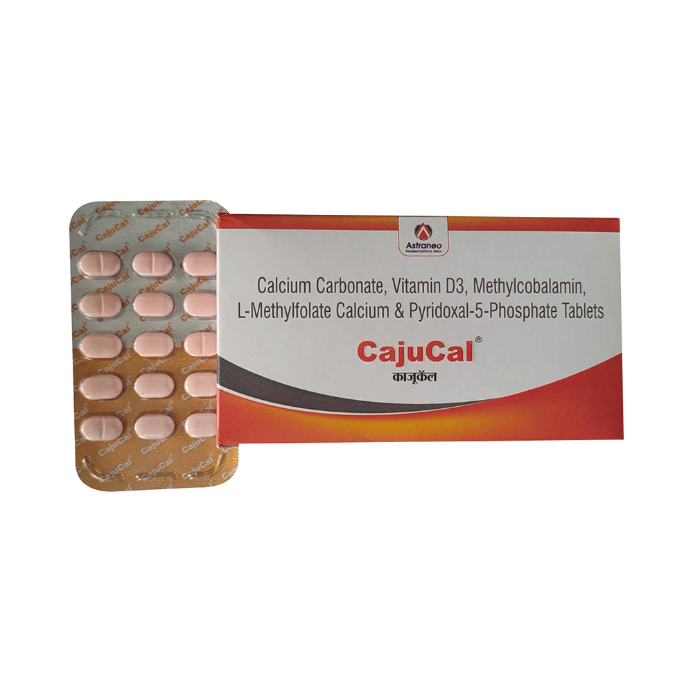 CajuCal Tablet is a combination of five medicines : Calcium Carbonate, Vitamin D3, Methylcobalamin, L-Methyl Folate Calcium, and Pyridoxal-5-phosphate. Calcium carbonate is a dietary supplement used when the amount of calcium taken in the diet is not enough. Vitamin D3 is a form of vitamin D. It raises vitamin D levels in your blood. This in turn raises calcium levels in your blood by helping you absorb more calcium from food. Methylcobalamin is a form of vitamin B12 that restores its level in the body thereby helping in treating certain anemias and nerve problems. L-Methyl Folate Calcium and Pyridoxal-5-phosphate are nutritional supplements that provide essential nutrients to our body and improve overall health.