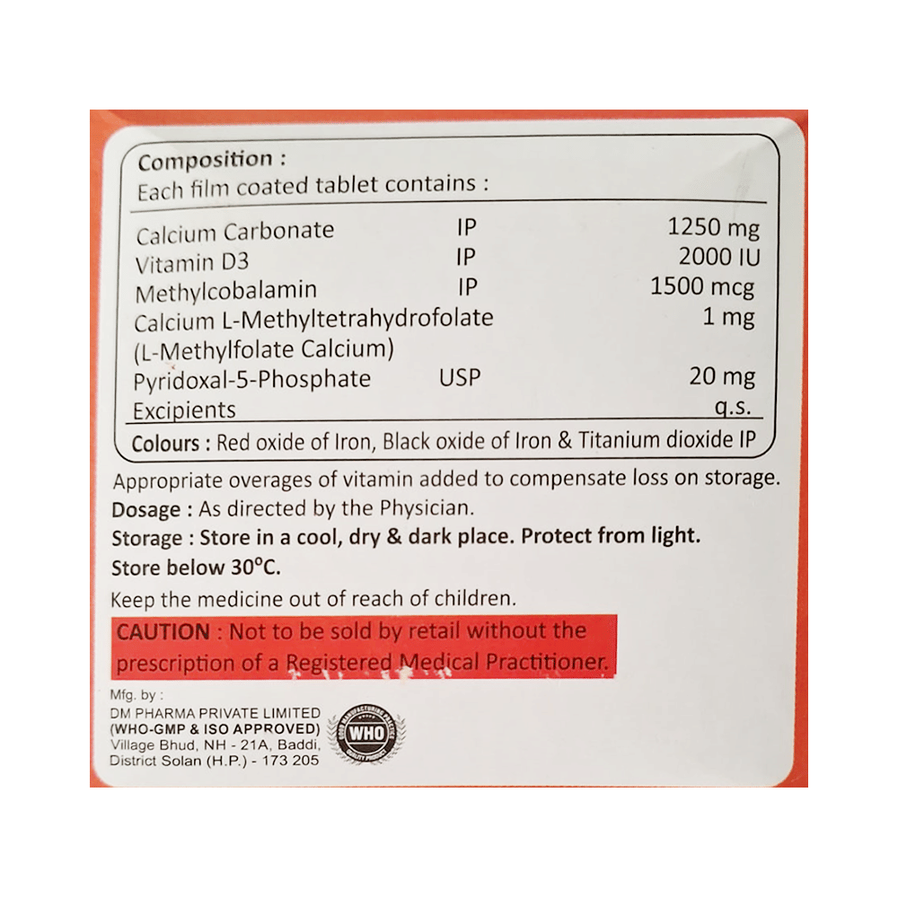 Salt Composition: Calcium Carbonate (1250mg) + Vitamin D3 (2000IU) + Methylcobalamin (1500mcg) + L-Methyl Folate Calcium (1mg) + Pyridoxal-5-phosphate (20mg)