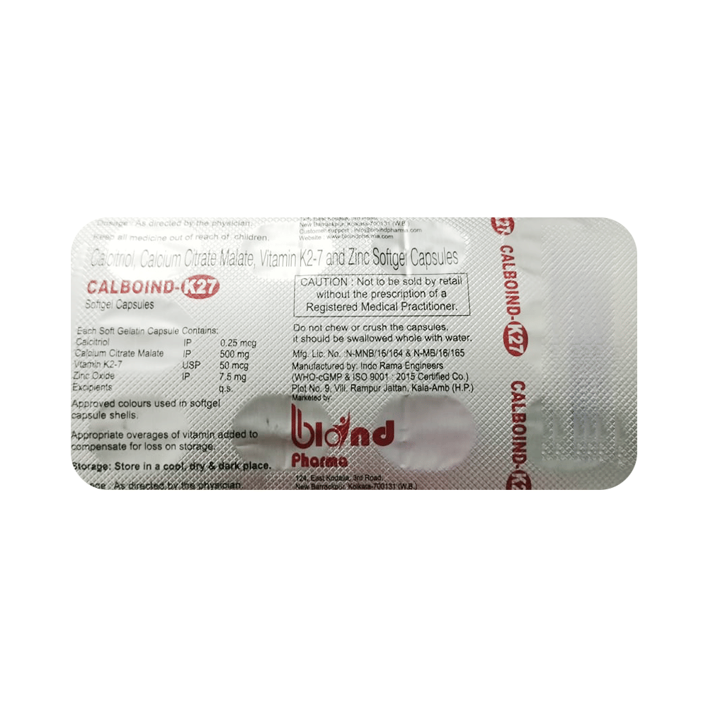 Calboind-K27 Softgel Capsule is a combination of four medicines : Calcitriol, Calcium Citrate Malate, Vitamin K2-7, and Zinc Oxide. Calcitriol is the active form of Vitamin D. It raises Vitamin D levels in your blood. This in turn raises calcium levels in your blood by helping you absorb more calcium from your intestine. Calcium citrate malate is a water-soluble calcium supplement. It increases the plasma calcium levels. Vitamin K2-7 plays a central role in the metabolism of calcium, the main mineral found in your bones and teeth. Vitamin K2-7 activates the calcium-binding actions of two proteins : matrix GLA protein and osteocalcin, which help to build and maintain bone health. Zinc oxide is a necessary trace element in the diet, forming an essential part of many enzymes, and playing an important role in protein synthesis and in cell division.