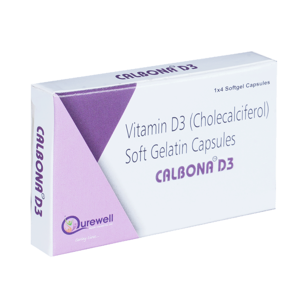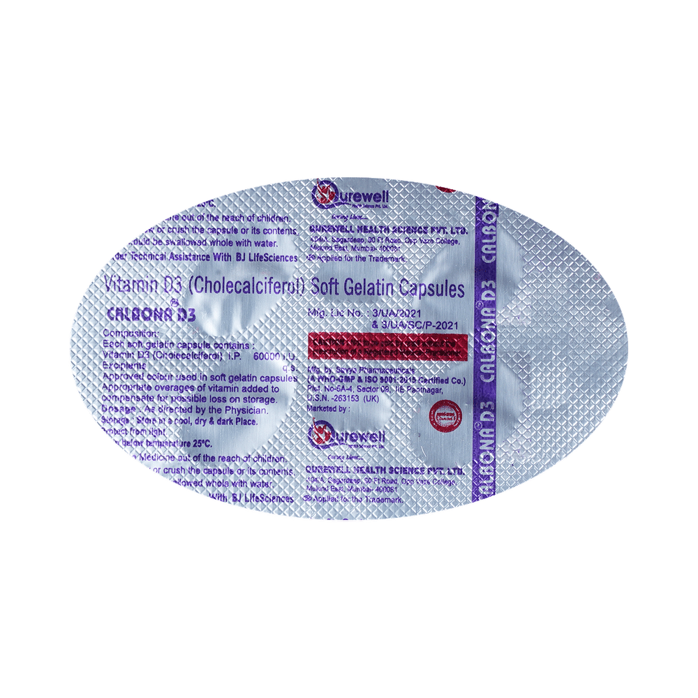 calBONA D3 Capsule is used in the treatment of vitamin D deficiency and osteoporosis. It helps the body to absorb calcium. Calcium is essential for maintaining strong and healthy bones. It is used when your diet does not provide enough calcium. calBONA D3 Capsule should be taken as directed by your doctor. It is best taken with or after food, as this helps your body absorb it, and you should take it regularly to get the most benefits. If you are using it to treat osteoporosis, you will also be prescribed other medicines. This medicine may be only part of a complete treatment program that includes making changes to your diet and taking calcium and vitamin supplements. Learn about the foods you should eat to ensure you get enough calcium and vitamin D.calBONA D3 Capsule has few side effects, and none are common. If you take too much, you may feel weakness, muscle pain, or a metallic taste in your mouth. If you experience any such side effects, speak with your doctor. They may be able to help you reduce or treat the symptoms.Before taking this medicine, tell your doctor if you have high calcium levels in your blood or if you have any heart, kidney, or liver disease. Some other medicines can decrease the absorption of vitamin D3, so let your doctor know about all the other medicines you are taking to make sure you are safe. This medicine may help during pregnancy when your body needs more vitamin D, but too much could harm your baby. Discuss it with your doctor.