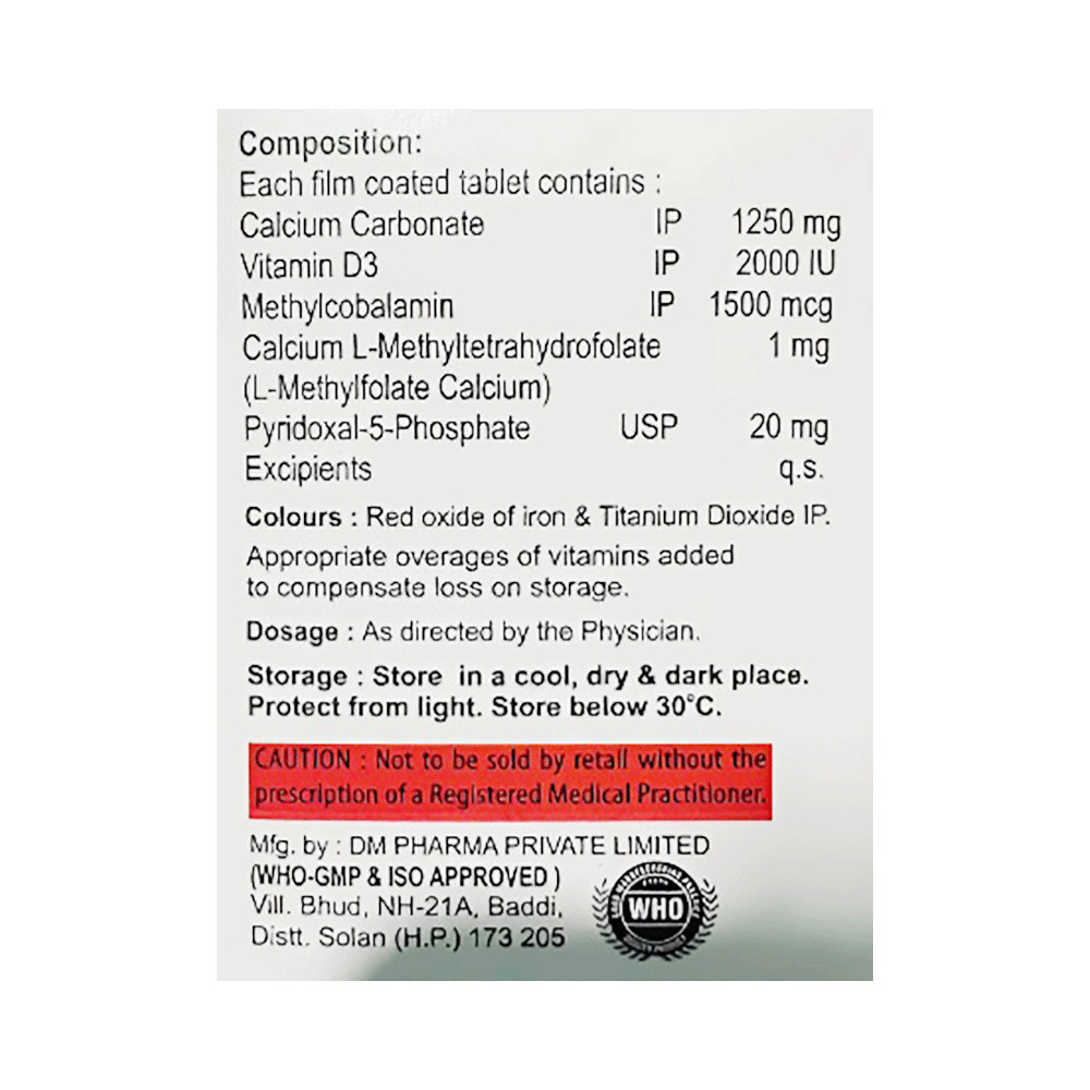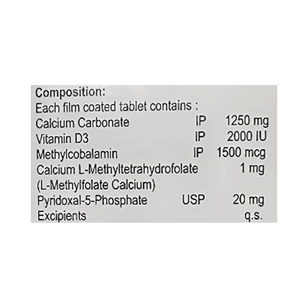 Salt Composition: Calcium Carbonate (1250mg) + Vitamin D3 (2000IU) + Methylcobalamin (1500mcg) + L-Methyl Folate Calcium (1mg) + Pyridoxal-5-phosphate (20mg)