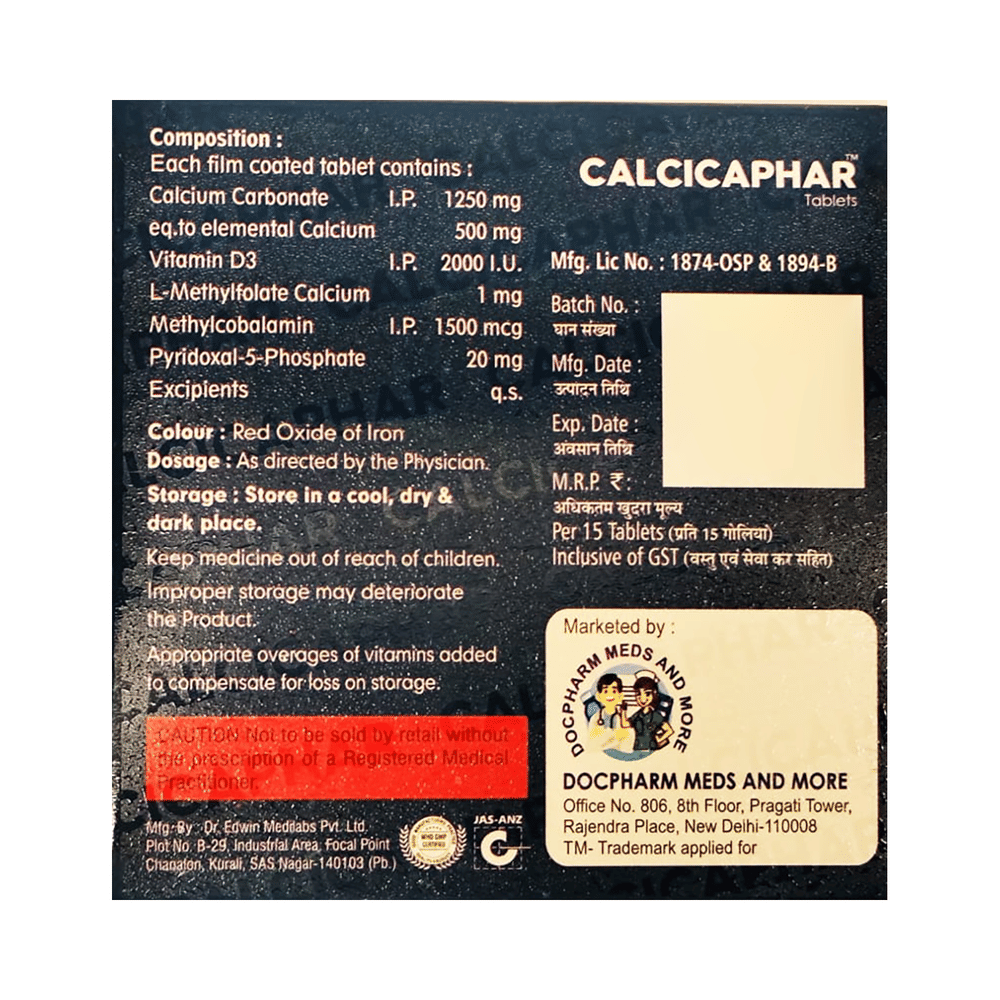 Calcicaphar Tablet is a combination of five medicines : Calcium Carbonate, Vitamin D3, Methylcobalamin, L-Methyl Folate Calcium, and Pyridoxal-5-phosphate. Calcium carbonate is a dietary supplement used when the amount of calcium taken in the diet is not enough. Vitamin D3 is a form of vitamin D. It raises vitamin D levels in your blood. This in turn raises calcium levels in your blood by helping you absorb more calcium from food. Methylcobalamin is a form of vitamin B12 that restores its level in the body thereby helping in treating certain anemias and nerve problems. L-Methyl Folate Calcium and Pyridoxal-5-phosphate are nutritional supplements that provide essential nutrients to our body and improve overall health.