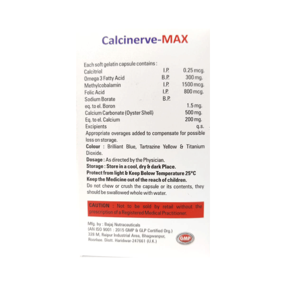 Calcinerve-Max Softgel Capsule is a combination of B vitamins and minerals. Calcitriol works by helping the body utilize more of the calcium present in ingested foods or supplements and regulating the body's production of parathyroid hormone. Calcium carbonate works in the blood by preventing or treating negative calcium balance seen in low serum calcium conditions. Calcium is required for healthy muscles, bones, nervous system, and heart. Omega-3 fatty acids may decrease the amount of triglycerides and other fats produced in the liver. Methylcobalamin corrects vitamin B12 deficiency, thereby helping in treating certain anemias and nerve problems. Folic acid is essential for the production of red blood cells. It prevents and treats folate deficiency and anemia. When taken by pregnant women, folic acid prevents miscarriage, preterm labor, and neural tube defects in infants. Boron improves the metabolism of key vitamins and minerals.
