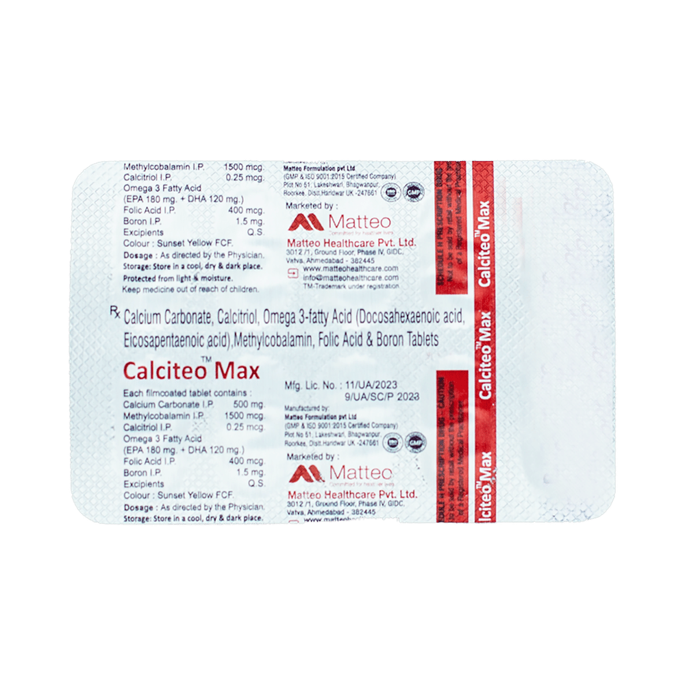 Calciteo Max Tablet is a nutritional supplement used for the treatment and prevention of nutritional deficiencies. It provides broad support to both the musculoskeletal and nervous systems, helping improve overall health and vitality. Take Calciteo Max Tablet in the exact dose and duration prescribed by your doctor. Take it regularly and avoid skipping doses. Calciteo Max Tablet is not a substitute for a balanced diet. For maximum benefits, combine it with a healthy diet rich in calcium and vitamin D, regular physical activity, and adequate hydration.There is limited data on the common side effects of Calciteo Max Tablet. Some people may experience mild side effects such as bloating, constipation, stomach discomfort, or a fishy aftertaste due to the omega-3 content. These symptoms are usually temporary and can often be managed by taking the capsule with food. If you experience any side effects that persist or worsen, consult your doctor for guidance.Before starting Calciteo Max Tablet, inform your doctor if you have any medical conditions such as kidney problems, a history of kidney stones, or high calcium levels in the blood. Pregnant and breastfeeding women should use this medicine only under medical supervision. Your doctor may recommend regular follow-up and blood tests to monitor your response to treatment. Make sure to attend all the appointments.