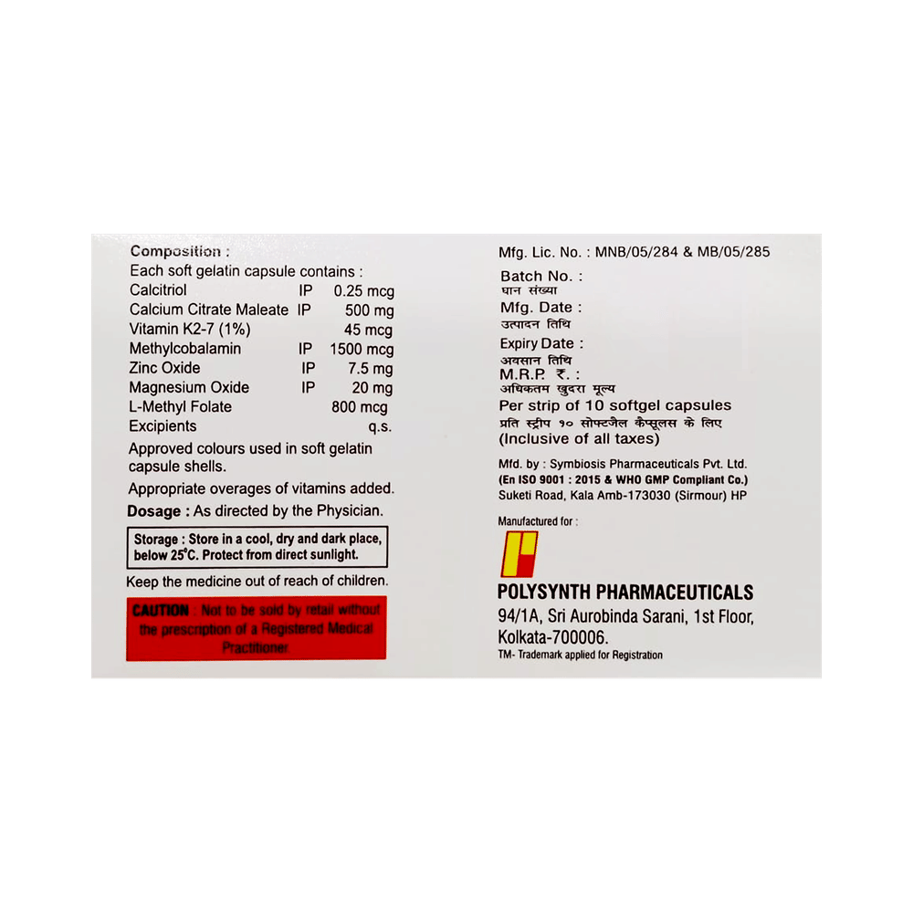 Salt Composition: Calcitriol (0.25mcg) + Calcium citrate (500mg) + Vitamin K2-7 (45mcg) + Methylcobalamin (1500mcg) + Zinc Oxide (7.5mg) + Magnesium Oxide (20mg) + L-Methyl Folate (800mcg)