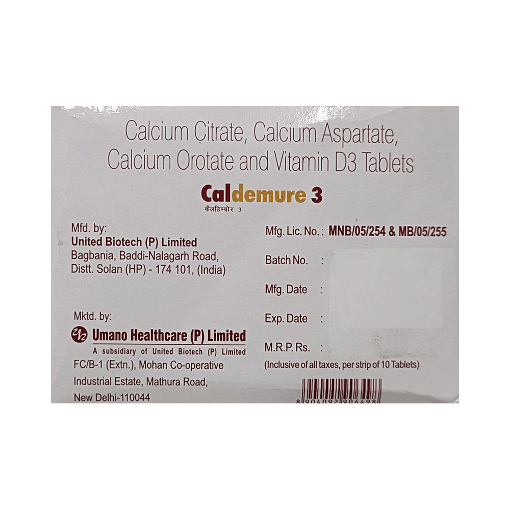 Caldemure 3 Tablet is a combination of mineral and vitamin supplements prescribed to treat nutritional deficiencies. It ensures the proper growth and functioning of the body and strengthens immunity. Caldemure 3 Tablet may be taken with or without food. The dose and duration of the treatment depend on your condition. Take the medicine for as long as your doctor has prescribed even if you begin to feel better.This medicine is usually safe and has little or no side effects. However, if you experience any symptoms while taking it, let your doctor know. They may be able to help by adjusting the dose or suggesting ways to prevent them.Before receiving Caldemure 3 Tablet, inform the doctor if you have any other health conditions or are taking other medicines. Pregnant or breastfeeding women are also advised to consult their doctors before receiving this medicine.