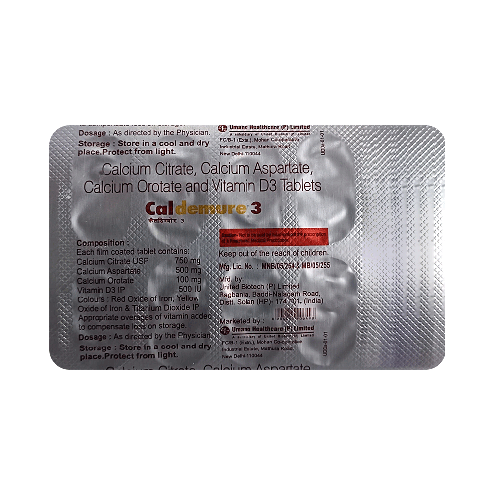 Caldemure 3 Tablet is a combination of vitamins and minerals. Calcium citrate, calcium aspartate, and calcium orotate are forms of calcium. Calcium plays a vital role in building and maintaining strong bones and muscles. It aids proper nerve transmission and nervous control over muscles and helps blood vessels relax and tighten, which helps move blood throughout the body. It also acts as a cofactor for various enzymes in the body that are essential for different biochemical reactions. Vitamin D3 works by helping the body use more of the calcium found in food or supplements.