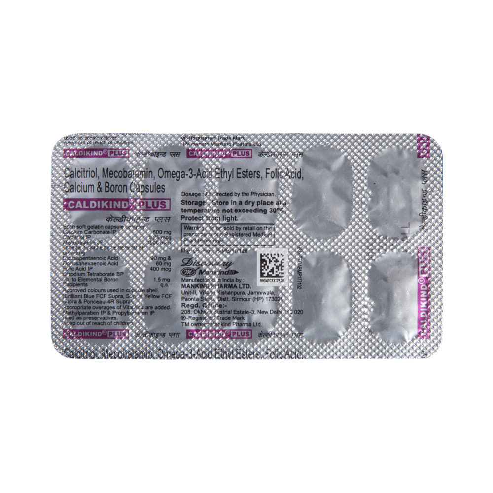 Caldikind Plus Soft Gelatin Capsule is a combination of B vitamins and minerals. Calcitriol works by helping the body utilize more of the calcium present in ingested foods or supplements and regulating the body's production of parathyroid hormone. Calcium carbonate works in the blood by preventing or treating negative calcium balance seen in low serum calcium conditions. Calcium is required for healthy muscles, bones, nervous system, and heart. Omega-3 fatty acids may decrease the amount of triglycerides and other fats produced in the liver. Methylcobalamin corrects vitamin B12 deficiency, thereby helping in treating certain anemias and nerve problems. Folic acid is essential for the production of red blood cells. It prevents and treats folate deficiency and anemia. When taken by pregnant women, folic acid prevents miscarriage, preterm labor, and neural tube defects in infants. Boron improves the metabolism of key vitamins and minerals.