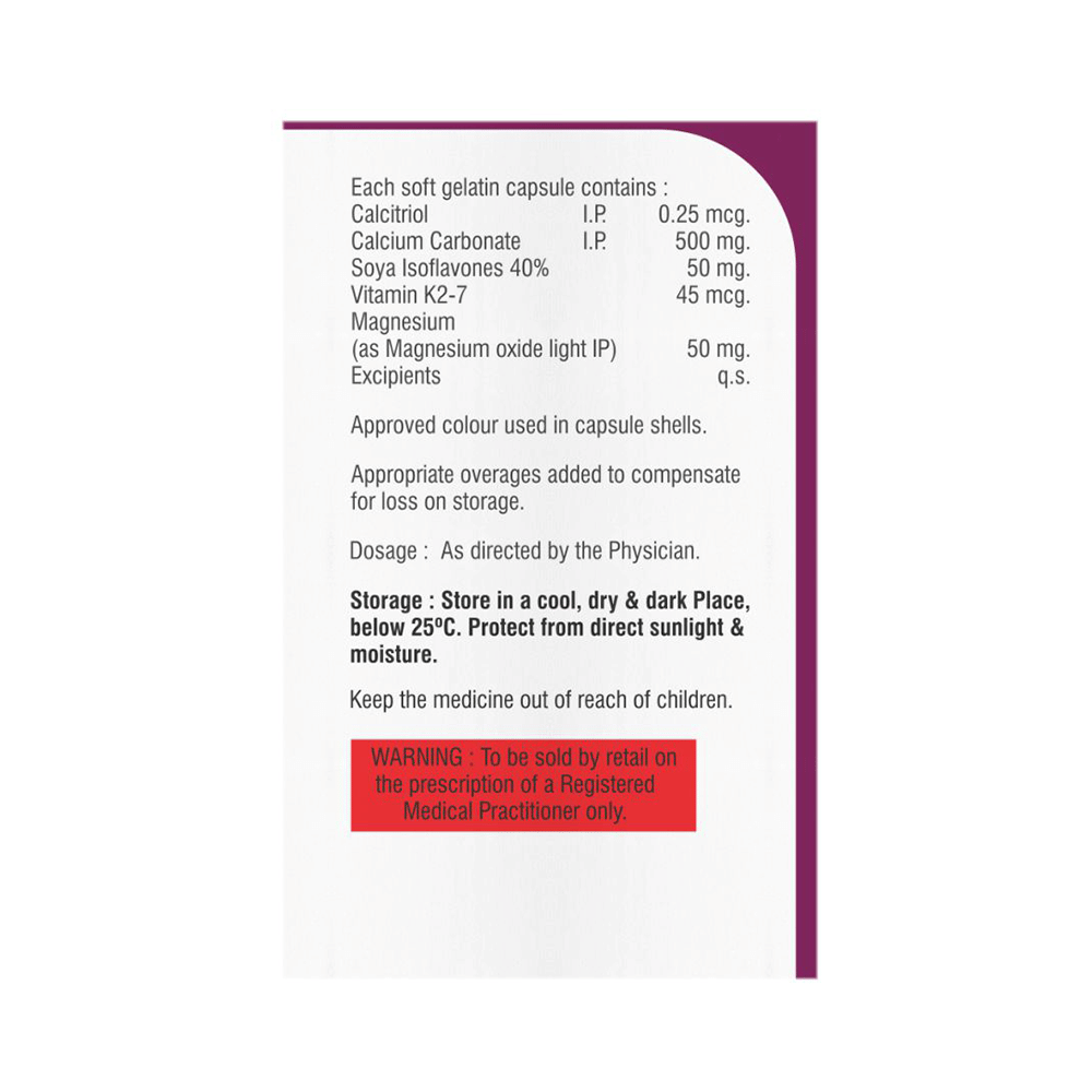 Salt Composition: Calcitriol (0.25mcg) + Calcium Carbonate (500mg) + Magnesium Oxide (50mg) + Soya Isoflavones (50mg) + Vitamin K2-7 (45mcg)