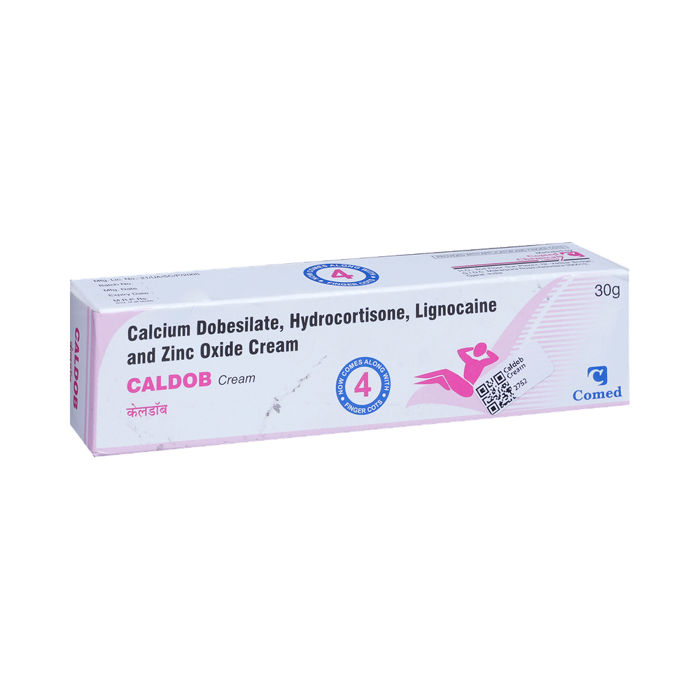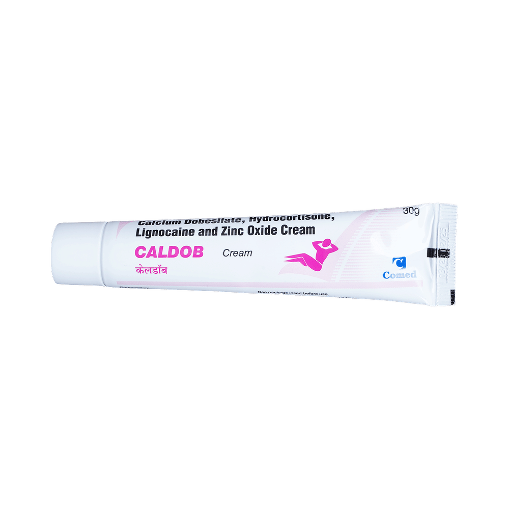 Caldob Cream is a combination of four medicines: Lidocaine / Lignocaine, Calcium Dobesilate, Hydrocortisone and Zinc. Lidocaine / Lignocaine is a local anesthetic which works by blocking pain signals from the nerves to brain, thereby decreasing the sensation of pain. Calcium Dobesilate is a vasoprotective medicine which works on the walls of the small blood vessels and reduces their leakage and fragility. It also improves blood flow by decreasing viscosity/thickness of blood, thereby relieving inflammation (redness and swelling) in piles/haemorrhoids and promoting healing. Hydrocortisone is a steroid which reduces redness, itching, and swelling due to piles/haemorrhoids. Zinc has astringent and antiseptic action.