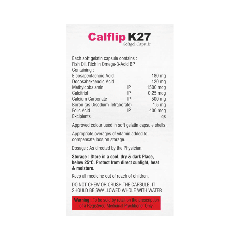 Calflip K27 Softgel Capsule is a combination of B vitamins and minerals. Calcitriol works by helping the body utilize more of the calcium present in ingested foods or supplements and regulating the body's production of parathyroid hormone. Calcium carbonate works in the blood by preventing or treating negative calcium balance seen in low serum calcium conditions. Calcium is required for healthy muscles, bones, nervous system, and heart. Omega-3 fatty acids may decrease the amount of triglycerides and other fats produced in the liver. Methylcobalamin corrects vitamin B12 deficiency, thereby helping in treating certain anemias and nerve problems. Folic acid is essential for the production of red blood cells. It prevents and treats folate deficiency and anemia. When taken by pregnant women, folic acid prevents miscarriage, preterm labor, and neural tube defects in infants. Boron improves the metabolism of key vitamins and minerals.