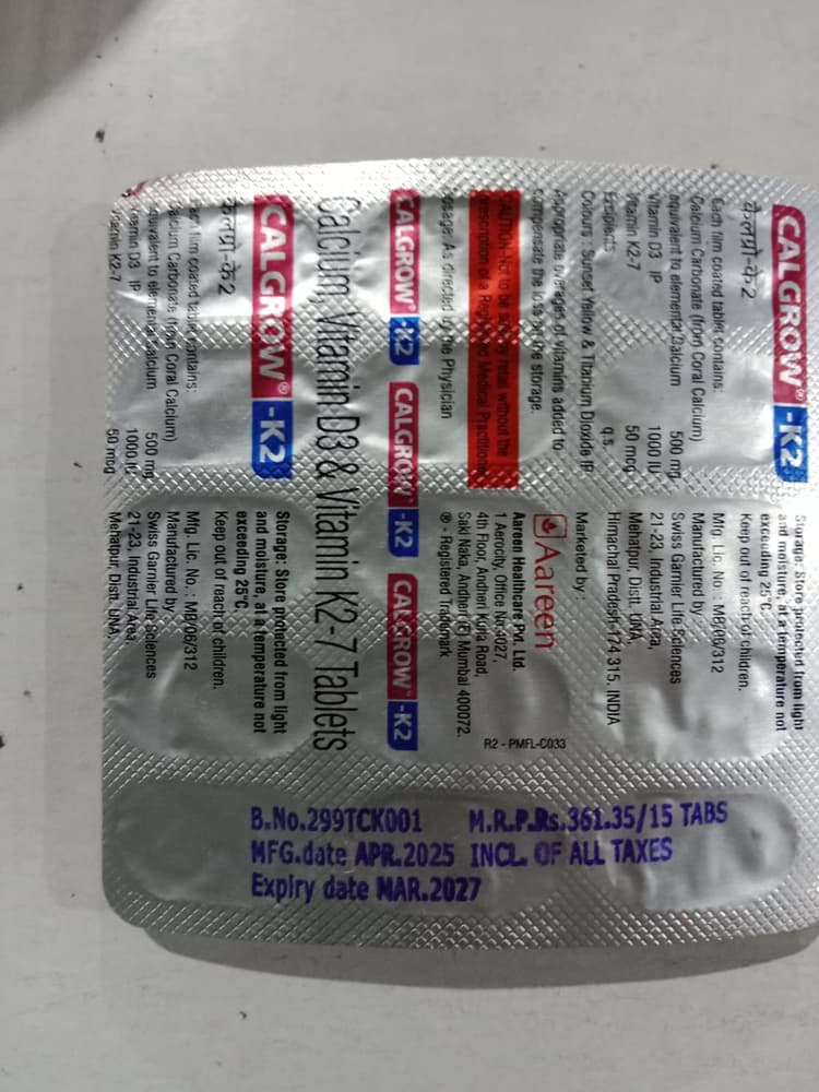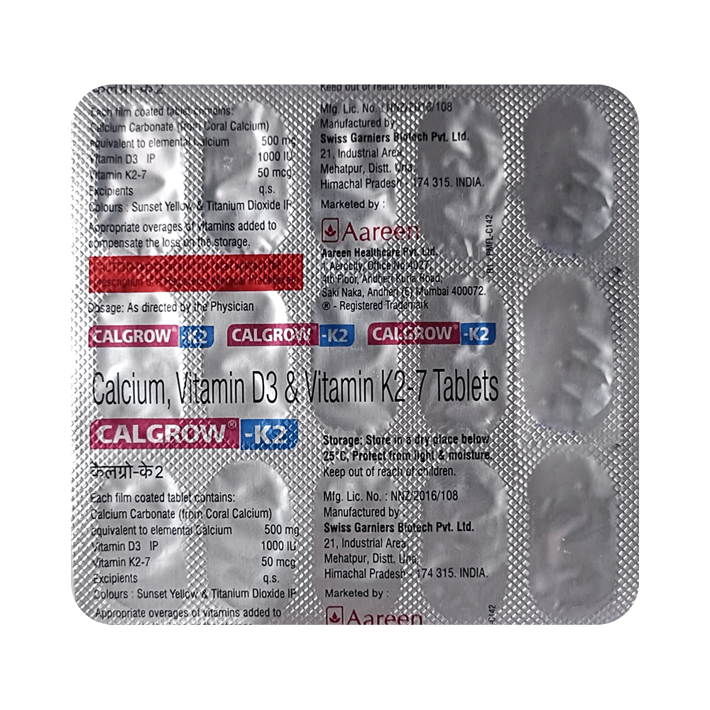 Calgrow-K2 Tablet is a combination of Calcitriol, Calcium Carbonate, and Vitamin K2-7. Calcitriol is the active form of Vitamin D. It raises Vitamin D levels in your blood. This in turn raises calcium levels in your blood by helping you absorb more calcium from your intestine. Calcium carbonate is a dietary supplement used when the amount of calcium taken in the diet is not enough. Vitamin K2-7 plays a central role in the metabolism of calcium, the main mineral found in your bones and teeth. Vitamin K2-7 activates the calcium-binding actions of two proteins : matrix GLA protein and osteocalcin, which help to build and maintain bone health.