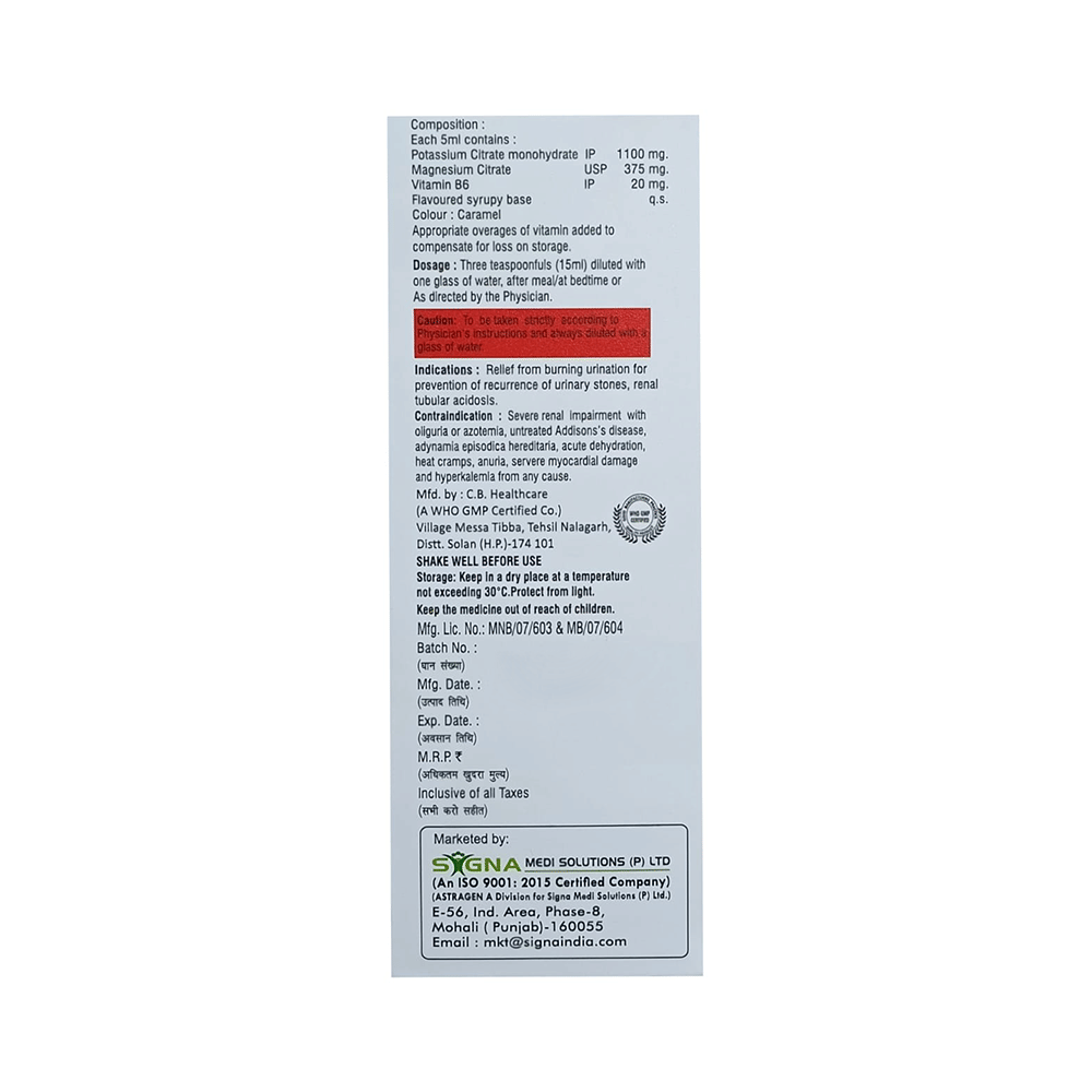 Salt Composition: Potassium Citrate (1000mg/5ml) + Magnesium Citrate (375mg/5ml) + Vitamin B6 (Pyridoxine) (20mg/5ml)