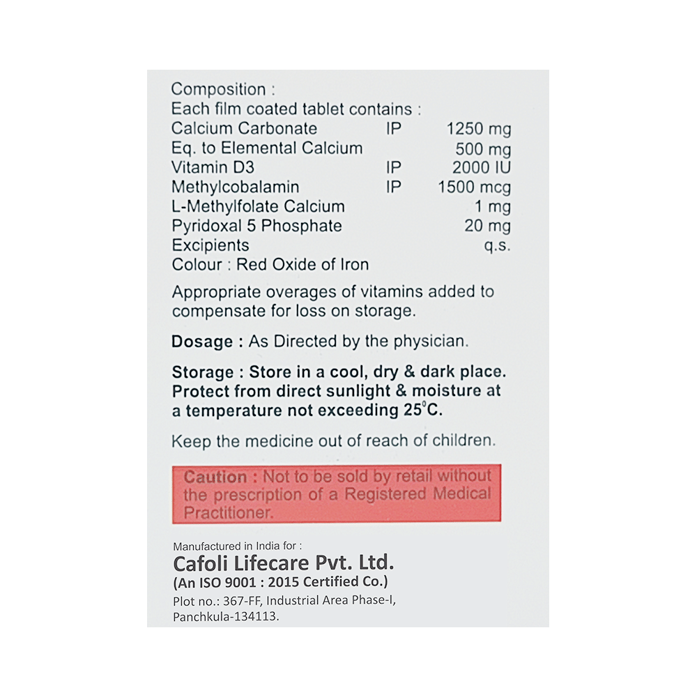 Salt Composition: Calcium Carbonate (1250mg) + Vitamin D3 (2000IU) + Methylcobalamin (1500mcg) + L-Methyl Folate Calcium (1mg) + Pyridoxal-5-phosphate (20mg)