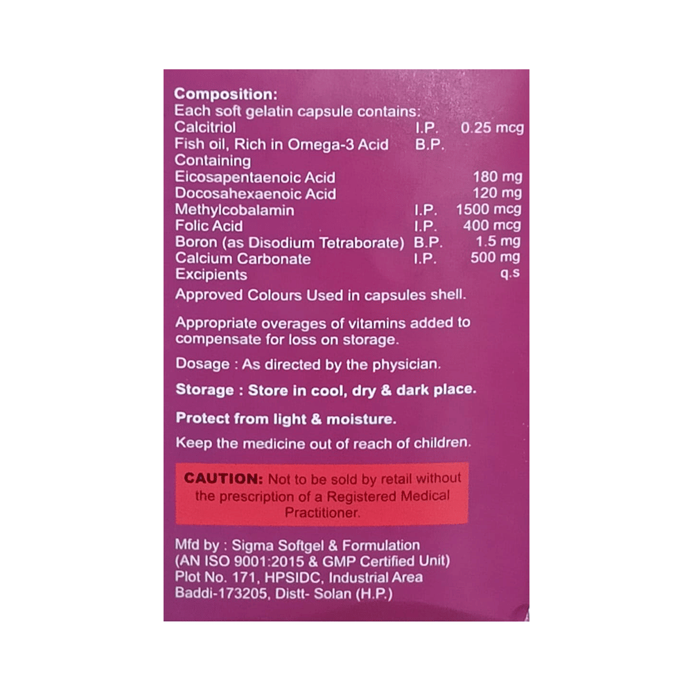 Salt Composition: Calcitriol (0.25mcg) + Calcium Carbonate (500mg) + Omega-3 fatty acid (300mg) + Methylcobalamin (1500mcg) + Folic Acid (400mcg) + Boron (1.5mg)