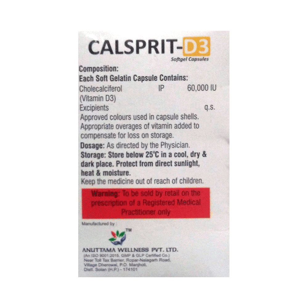 Calsprit-D3 Softgel Capsule is a form of vitamin D. It raises vitamin D levels in your blood. This, in turn, increases calcium levels in your blood by helping you absorb more calcium from food.