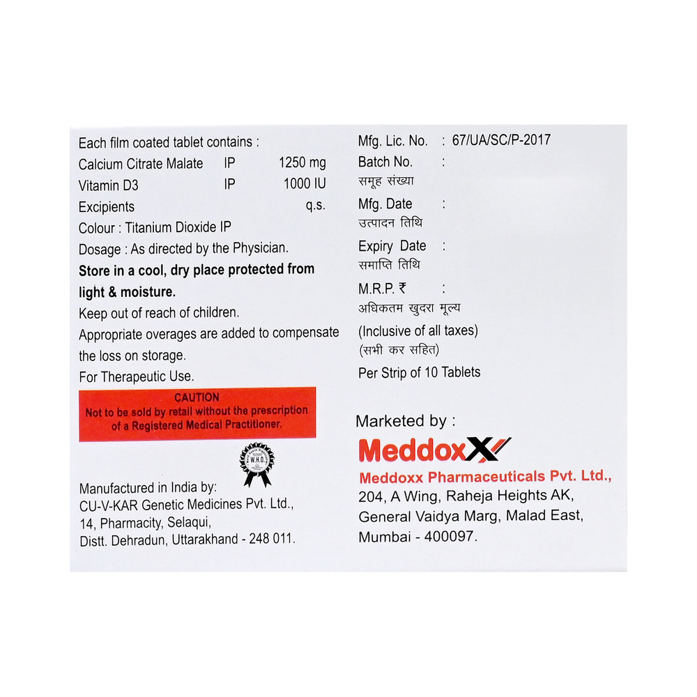 Salt Composition: Calcium (1250mg) + Vitamin D3 (1000IU)