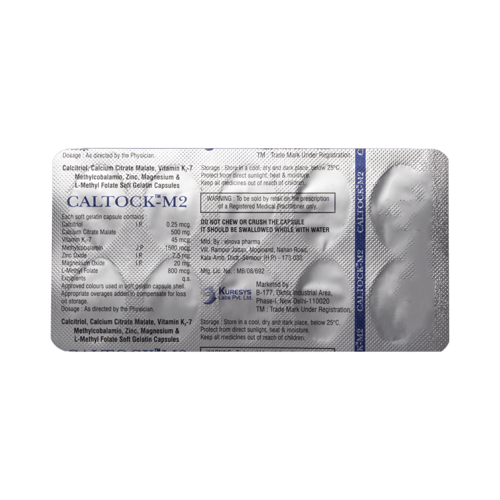 Caltock-M2 Soft Gelatin Capsule is a combination of medicines that is used to treat nutritional deficiencies. It helps in proper growth and development of cells, bone and improves heart health. It also helps in protein synthesis and production of blood cells like red blood cells or white blood cells and boosts immunity. Caltock-M2 Soft Gelatin Capsule may be taken with or without food. It should be used in the dose and duration as prescribed by your doctor. It is advised to take this medicine at a fixed time.This medicine should not be taken more than the recommended dose. It is usually a safe medicine with very minimal or no side effects. However, if you experience severe diarrhea, vomiting, or constipation, you should consult your doctor without delay.Before taking this medicine, tell your doctor if you have any other health conditions. Inform your doctor if you are taking any other medicines or if you are pregnant or breastfeeding.
