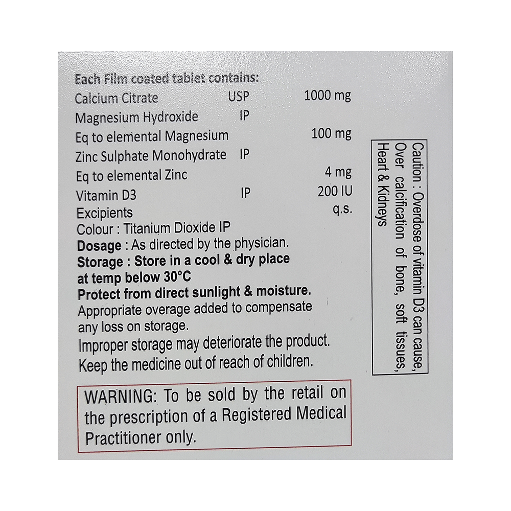 Salt Composition: Calcium citrate (1000mg) + Vitamin D3 (200IU) + Zinc Sulfate (4mg) + Magnesium Sulphate (100mg)