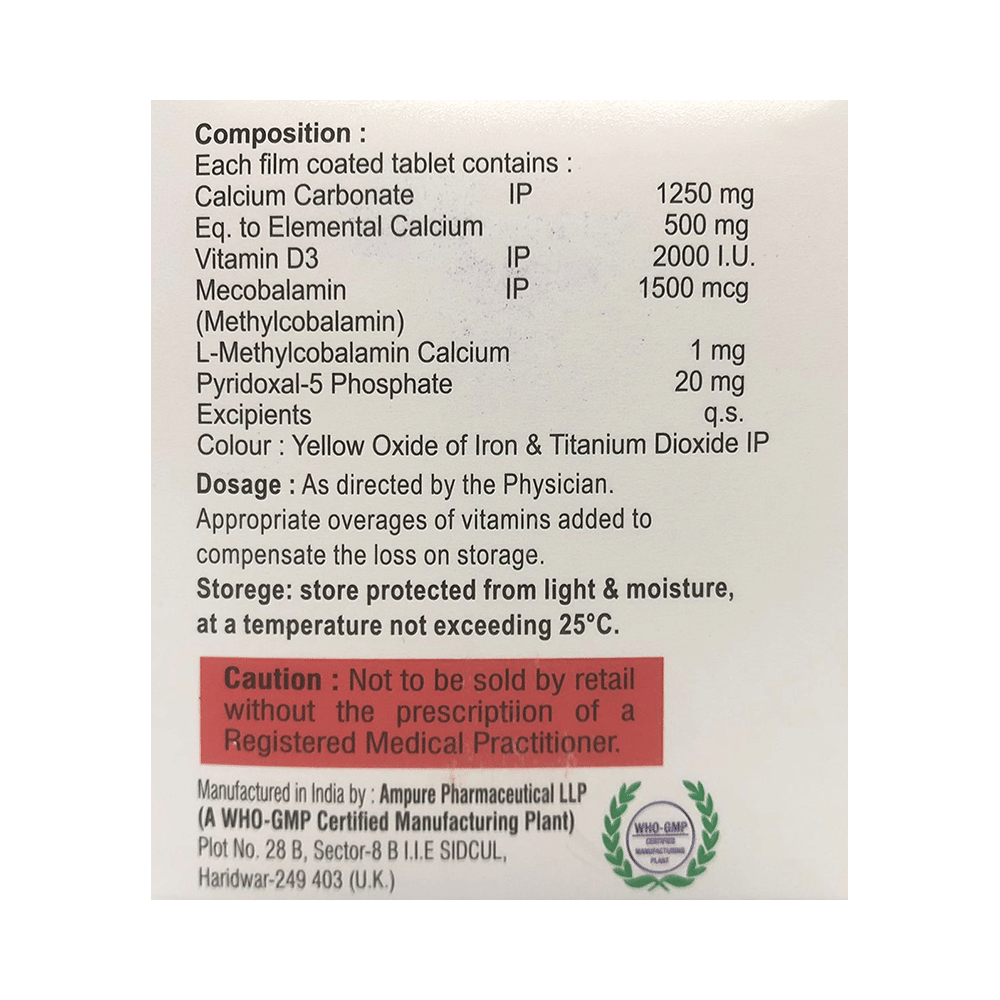 Salt Composition: Calcium Carbonate (1250mg) + Vitamin D3 (2000IU) + Methylcobalamin (1500mcg) + L-Methyl Folate Calcium (1mg) + Pyridoxal-5-phosphate (20mg)