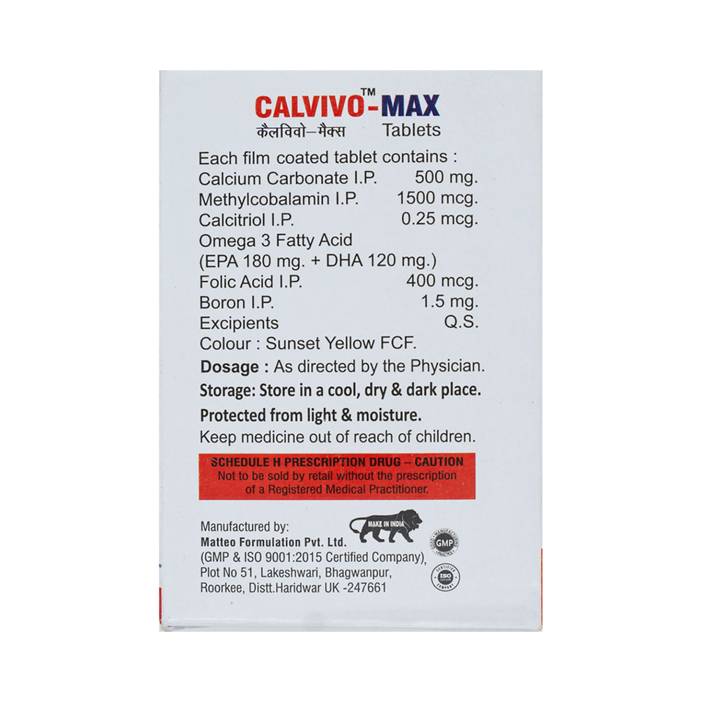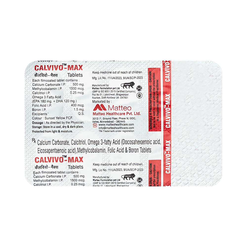 Calvivo-Max Tablet is a combination of B vitamins and minerals. Calcitriol works by helping the body utilize more of the calcium present in ingested foods or supplements and regulating the body's production of parathyroid hormone. Calcium carbonate works in the blood by preventing or treating negative calcium balance seen in low serum calcium conditions. Calcium is required for healthy muscles, bones, nervous system, and heart. Omega-3 fatty acids may decrease the amount of triglycerides and other fats produced in the liver. Methylcobalamin corrects vitamin B12 deficiency, thereby helping in treating certain anemias and nerve problems. Folic acid is essential for the production of red blood cells. It prevents and treats folate deficiency and anemia. When taken by pregnant women, folic acid prevents miscarriage, preterm labor, and neural tube defects in infants. Boron improves the metabolism of key vitamins and minerals.