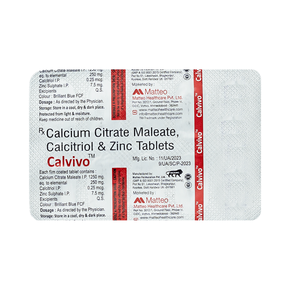 Calvivo Tablet is a combination of three medicines: Calcitriol, Calcium Carbonate and Zinc Sulfate which treat osteoporosis. Calcitriol helps your body effectively absorb Calcium Carbonate and additionally supports the muscles needed to avoid falls. Calcium Carbonate and Zinc Sulfate help build and maintain bones.