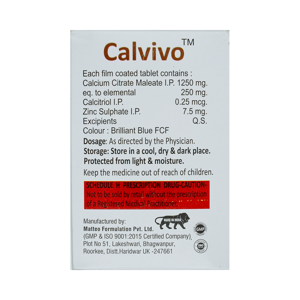 In Vitamin & mineral deficiencyCalvivo Tablet is a calcium supplement that helps in the treatment of calcium deficiency. It improves the level of vitamin D in your blood which in turn helps in absorption of more calcium from your intestine. Calvivo Tablet will help to keep your bones strong and healthy and reduce the risk of any bone disorders like osteoporosis.