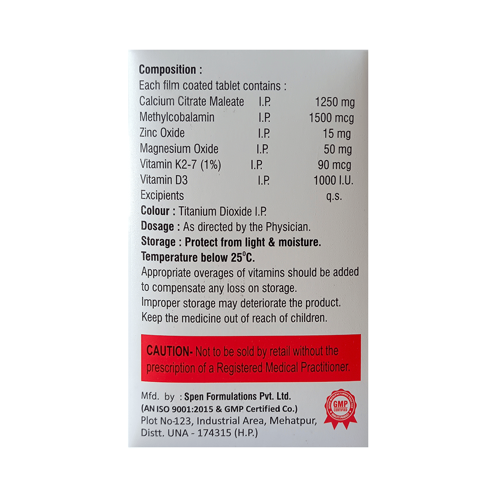 Salt Composition: Calcium Citrate Malate (1250mg) + Magnesium Oxide (50mg) + Methylcobalamin (1500mcg) + Vitamin D3 (1000IU) + Vitamin K2-7 (90mcg) + Zinc Oxide (15mg)
