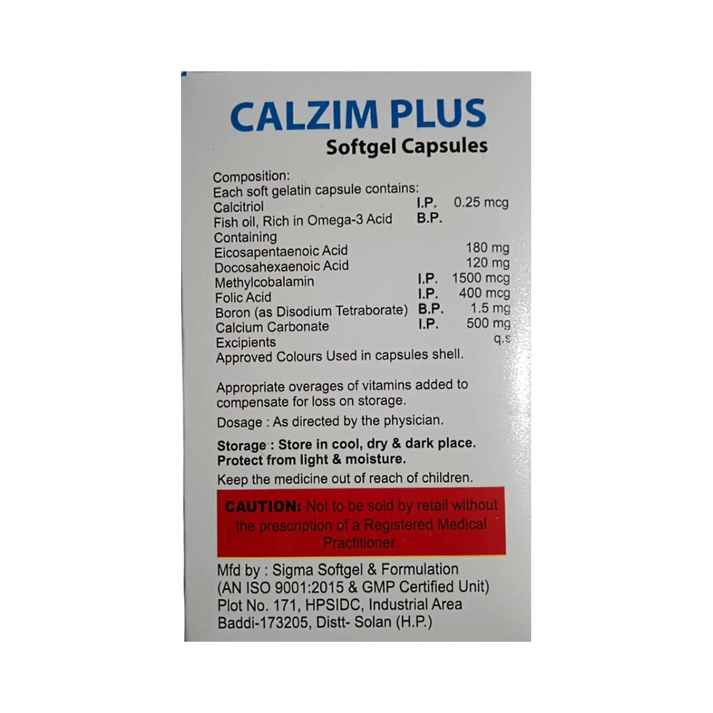 Calzim Plus Softgel Capsule is a combination of B vitamins and minerals. Calcitriol works by helping the body utilize more of the calcium present in ingested foods or supplements and regulating the body's production of parathyroid hormone. Calcium carbonate works in the blood by preventing or treating negative calcium balance seen in low serum calcium conditions. Calcium is required for healthy muscles, bones, nervous system, and heart. Omega-3 fatty acids may decrease the amount of triglycerides and other fats produced in the liver. Methylcobalamin corrects vitamin B12 deficiency, thereby helping in treating certain anemias and nerve problems. Folic acid is essential for the production of red blood cells. It prevents and treats folate deficiency and anemia. When taken by pregnant women, folic acid prevents miscarriage, preterm labor, and neural tube defects in infants. Boron improves the metabolism of key vitamins and minerals.