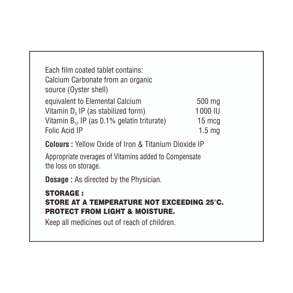 Salt Composition: Calcium (500mg) + Vitamin B12 (15mcg) + Vitamin D3 (1000IU) + Folic Acid (1.5mg)