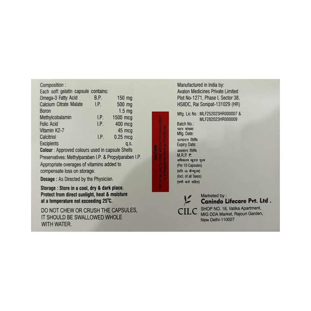 Salt Composition: Omega-3 fatty acid (150mg) + Calcium Citrate Malate (500mg) + Boron (1.5mg) + Methylcobalamin (1500mcg) + Folic Acid (400mcg) + Vitamin K2-7 (45mcg) + Calcitriol (0.25mcg)