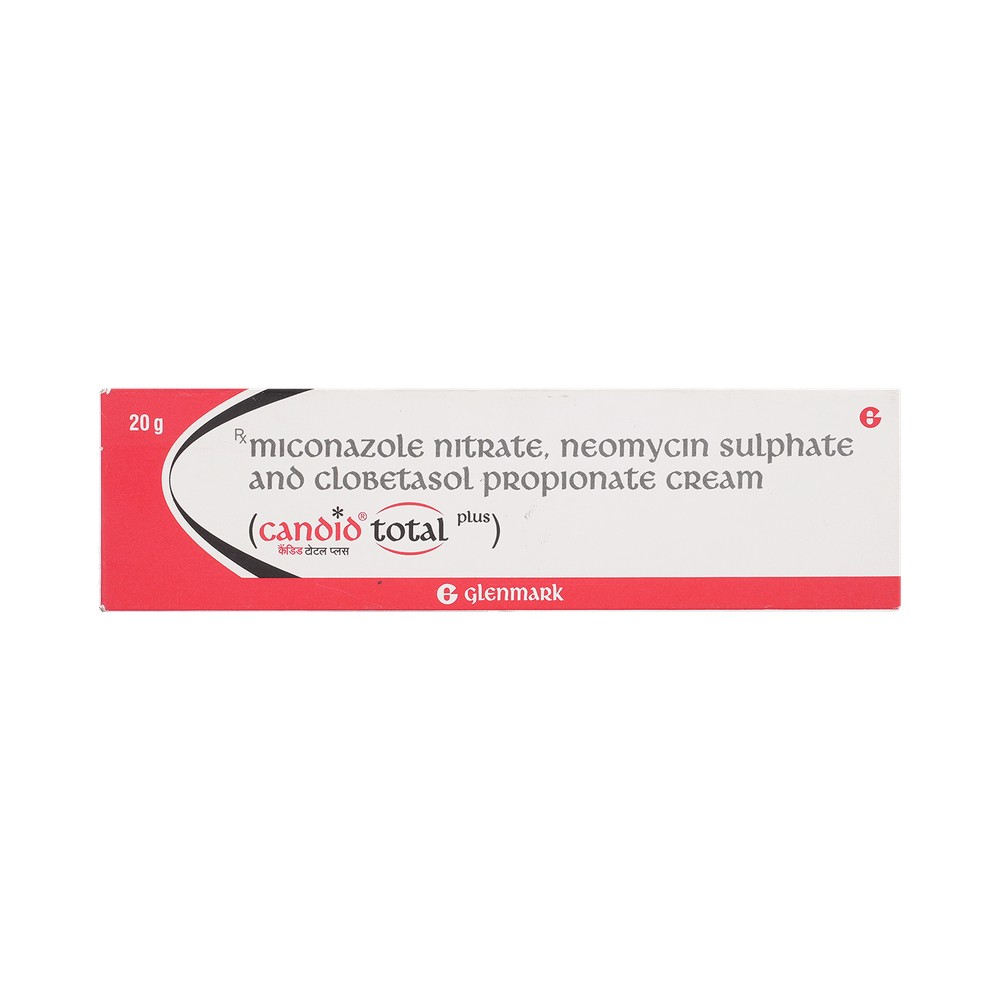 Candid Total Plus Cream is a combination medicine used in the treatment of various types of skin infections. It minimizes symptoms of inflammation such as redness, swelling, and itching by acting against the infection-causing microorganisms. Candid Total Plus Cream is only meant for external use and should be used as advised by your doctor. A thin layer of the medicine should be applied only to the affected areas of the skin with clean and dry hands. If it gets into your eyes, nose, mouth, or vagina rinse with water. It may take several days to weeks for your symptoms to improve, but you should keep using this medicine regularly. The course of the treatment should be completed to ensure better efficacy of the medicine. If your condition does not improve or gets worse, you should talk to your doctor.The most common side effect of this medicine includes itching, dryness, redness, and burning sensation at the application site. These are usually self-limiting. Serious side effects are rare. You must consult the doctor if you experience any allergic reaction (rashes, itching, swelling, shortness of breath, etc.).Before taking this medicine, it is important to tell your doctor if you are taking or have recently taken any other medicines for the same disease or other diseases. Pregnant and breastfeeding women should take this medicine with proper consultation and caution. If you are a known allergic to the medicine, you must refrain from using this medicine. You should consult the doctor about prescribing an alternative medicine for your condition.