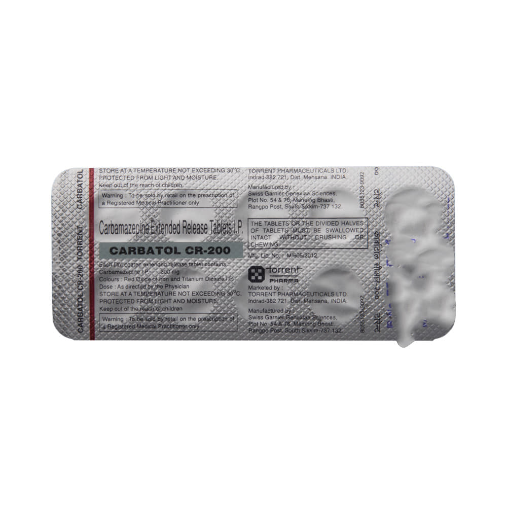 Carbatol CR 200 Tablet is an anti-epileptic medicine used to treat epilepsy. It helps prevent certain types of seizures (fits). It is also prescribed for a painful condition of the face, head, and neck known as trigeminal neuralgia and diabetes-related nerve pain (diabetic neuropathy). Carbatol CR 200 Tablet must be taken with or without food, but take it at the same time every day. The dose and how often you need to take it will be decided by your doctor so that you get the right amount to control your symptoms. It may be increased gradually. Many other medicines can interfere with this medicine so tell your doctor about all the medicines you are taking to make sure it is safe.You can take this medicine with or without food but take it regularly at the same time each day to get the maximum benefit. It is important to take this medicine for as long as you are advised, even if you feel well. Missing even a single dose may trigger a seizure and, if you stop taking it abruptly, your condition may get worse.The most common side effects of this medicine include nausea, vomiting, feeling dizzy, tired or drowsy, unsteadiness (balance disorder), constipation, dry mouth, and itching. Some people may develop blurring of vision and slurred speech. Most of the side effects are not serious. However, let your doctor know straight away if you notice a skin rash or if your mood becomes depressed or if you develop any thoughts about harming yourself. Before taking Carbatol CR 200 Tablet, tell your doctor if you have any heart problems, kidney or liver disease, difficulty in urinating, or any mental illness like depression. These conditions may affect your treatment. You may be advised some blood tests (eg. CBC) before starting treatment and then periodically thereafter, to monitor your progress.