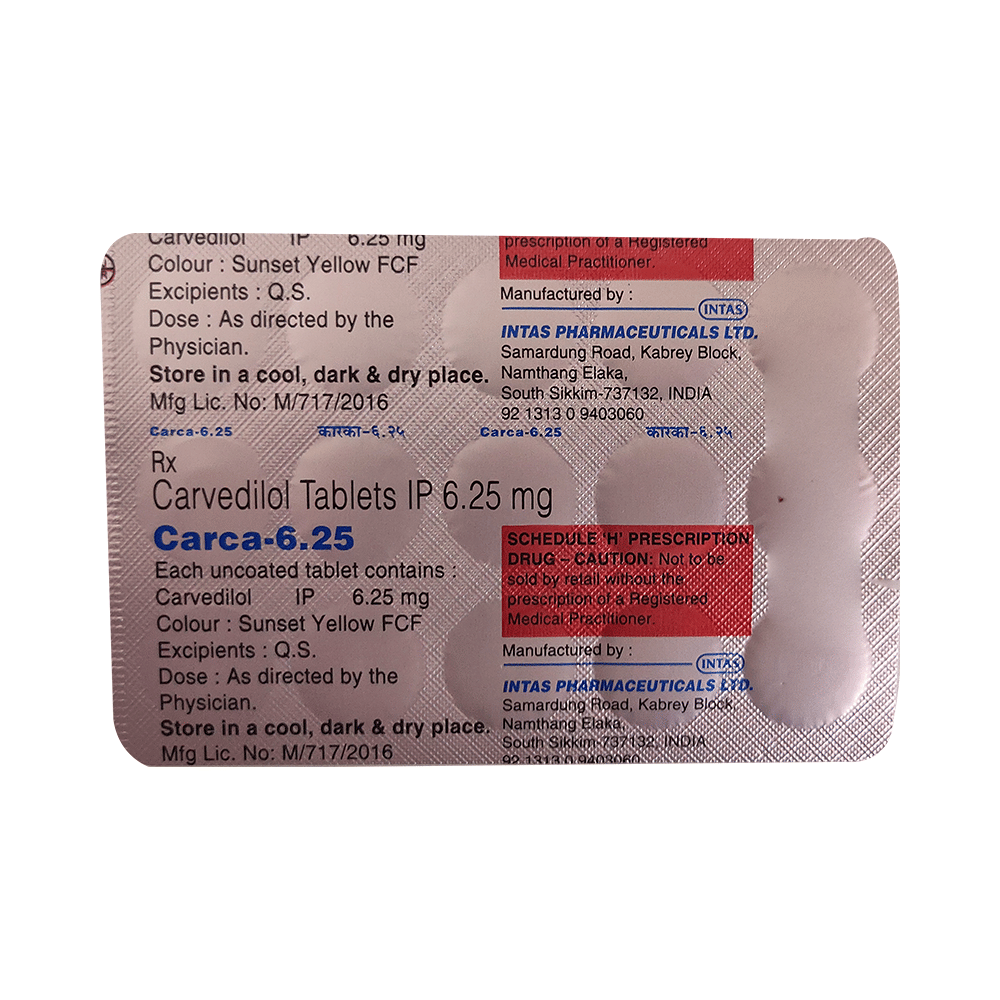 Carca 6.25 Tablet is a medicine used to treat high blood pressure, heart-related chest pain (angina), and heart failure. It works by relaxing the blood vessels, so that blood can flow more easily to the heart. Lowering blood pressure also helps prevent future heart attacks and strokes. Carca 6.25 Tablet should be taken with food. You should take it in the dose and duration as advised by the doctor. It is important to take it even if you feel well or your blood pressure is controlled. Do not stop this medicine without talking to the doctor, as your condition could get worse.Making some changes in your lifestyle will help improve your condition. These may include regular exercise, losing weight, smoking cessation, reducing alcohol intake, and reducing the amount of salt in your diet as advised by your doctor.This medicine is tolerated well by most patients, but it may have a few side effects. These include dizziness, headache, breathlessness, and tiredness. Let your doctor know if these side effects bother you or do not go away.Before taking this medicine, let your doctor know if you have any heart or kidney diseases. Pregnant or breastfeeding mothers should also consult their doctor before taking this medicine.