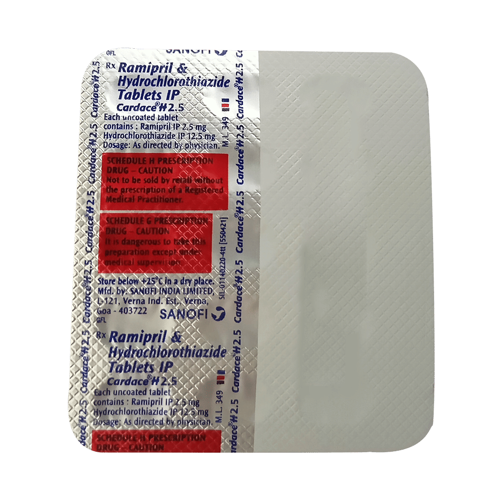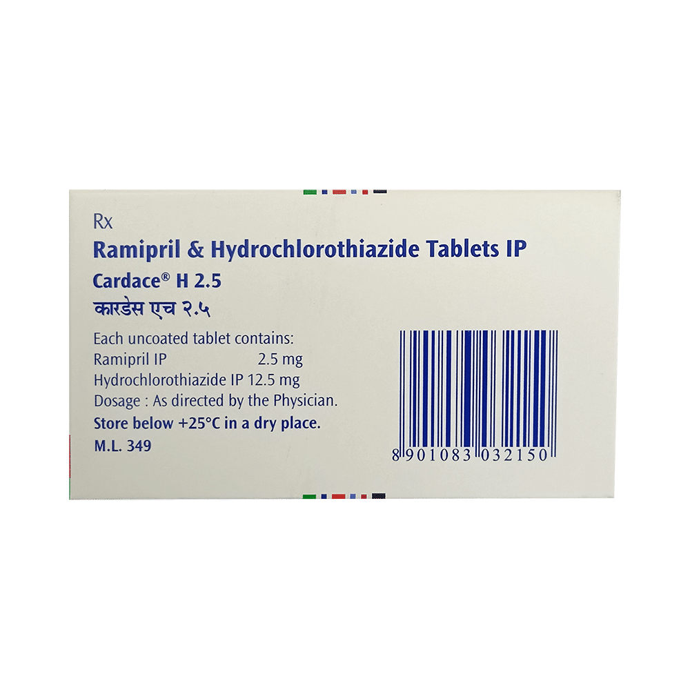 Cardace H 2.5 Tablet is a medicine used to treat hypertension (high blood pressure). It is a combination of two medicines that helps to control blood pressure when a single medication is not effective. It helps to reduce the chances of any future heart attack and stroke. Cardace H 2.5 Tablet is taken with or without food, preferably in the morning to avoid frequent urination at night. Keep taking it for as long as advised by your doctor. Even if you feel well, do not stop this medicine on your own because high blood pressure often has no symptoms. If you stop taking it, your condition may get worse. Keeping active with regular exercise, reducing your weight and eating a healthy diet will also help control your blood pressure. Follow your doctor’s advice while taking this medicine.Nausea, indigestion, taste change, and diarrhea are some common side effects of this medicine. Consult your doctor If any of these bother you, or get worse, or do not go away. Let your doctor know about cough or throat irritation that does not go away. Drink plenty of fluids while taking medicine to overcome muscle weakness, dry mouth, and extreme thirst. Dizziness may occur due to low blood pressure but this gets better with time.Before taking it, let your doctor know if you have any liver or kidney problems. Pregnant or breastfeeding women should also consult their doctor for advice before taking this medicine. You also need to tell your doctor what other medicines you are taking especially those used to treat high blood pressure or heart conditions. You should have your blood pressure, kidney function and the levels of salts such as potassium checked regularly to make sure that this medicine is working properly.