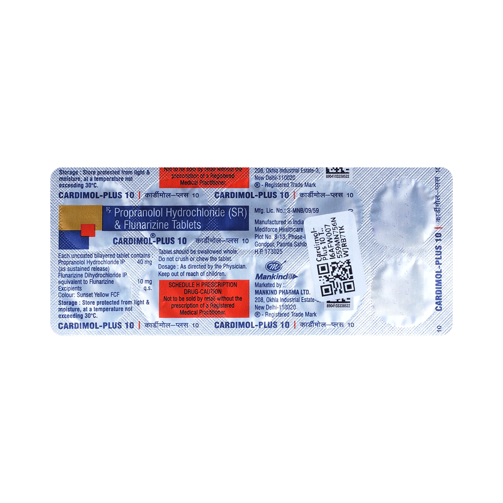 Cardimol-Plus 10 Tablet SR is a combination of two medicines: propranolol and flunarizine. Propranolol is a beta blocker, and flunarizine is a calcium channel blocker. They work together by stabilizing the reactive nerve cells and increasing the threshold for migraine activation. Flunarizine also helps in inhibiting cortical spreading depression (CSD—electric waves that move across the brain and cause pain and inflammation).