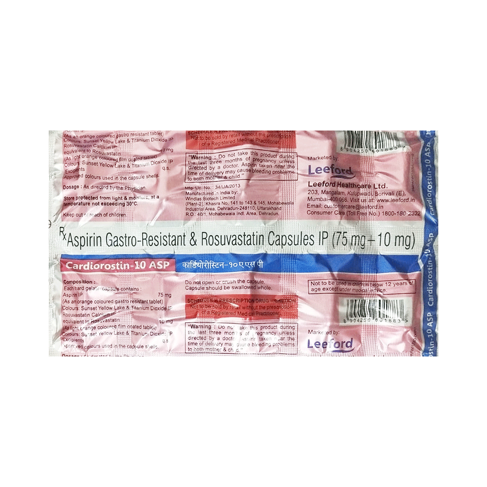 Cardiorostin 10 ASP Capsule is a combination of two medicines used to prevent heart attack, stroke, and angina. This medicine reduces the "bad" cholesterol (LDL) and triglycerides (fats) levels. Moreover, it also decreases the formation of blood clots. Cardiorostin 10 ASP Capsule should be taken with food to avoid stomach upset. You should take it regularly at evenly spaced intervals as per the schedule prescribed by your doctor. Taking it at the same time every day will help you remember to take it. The dose and duration of treatment will depend on what you are being treated for. Do not stop taking it until you have finished the complete course, even when you feel better. Lifestyle changes like low-fat diet, exercise and not smoking may help this medicine to work better.Nausea, abdominal pain, headache, and constipation are some common side effects of this medicine.This medicine increases your risk of bleeding, so it is important to be careful while shaving, cutting nails, using sharp objects, or engaging in contact sports (e.g., football, wrestling). Let your doctor know if you notice yellowing of skin, muscle pain or dark urine.Before taking this medicine, tell your doctor if you have liver or kidney disease or you are suffering from bleeding disorder. You must tell your doctor if you are pregnant, planning pregnancy or breastfeeding. You should also let your healthcare team know all other medicines you are taking as they may affect, or be affected by this medicine.