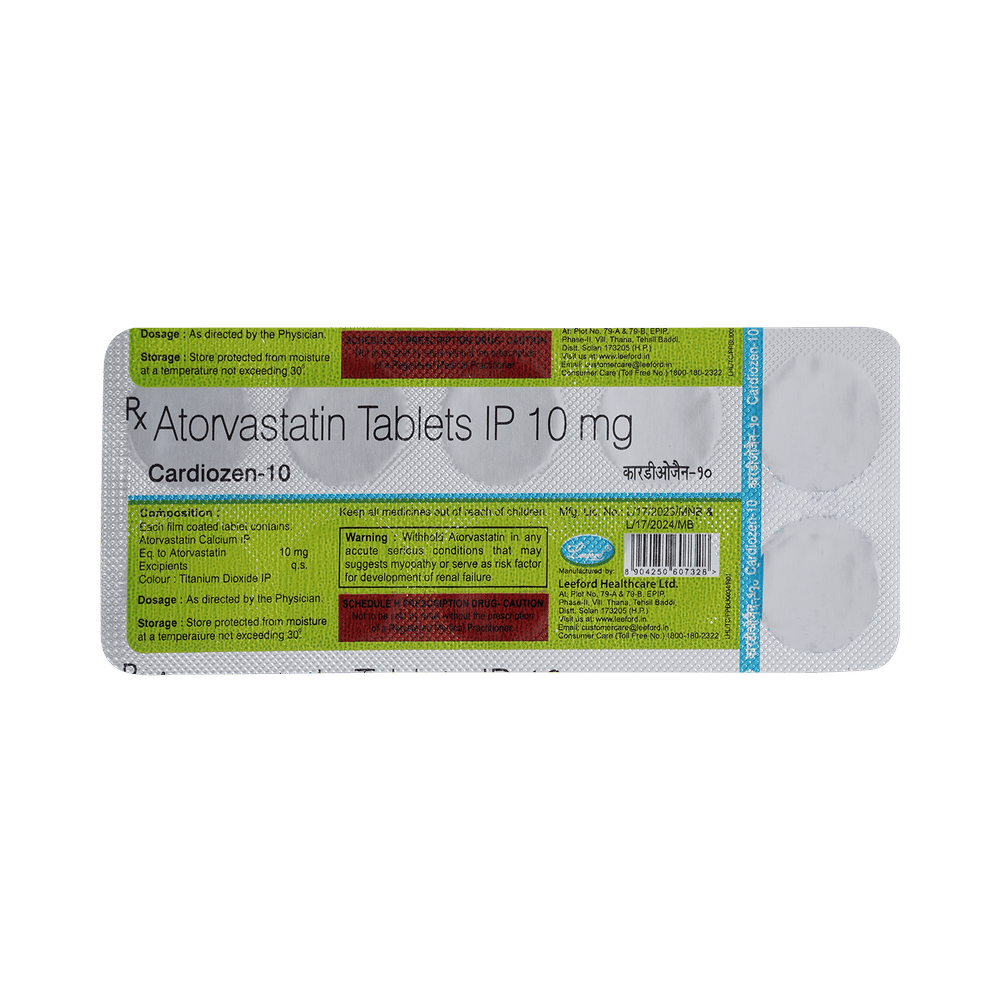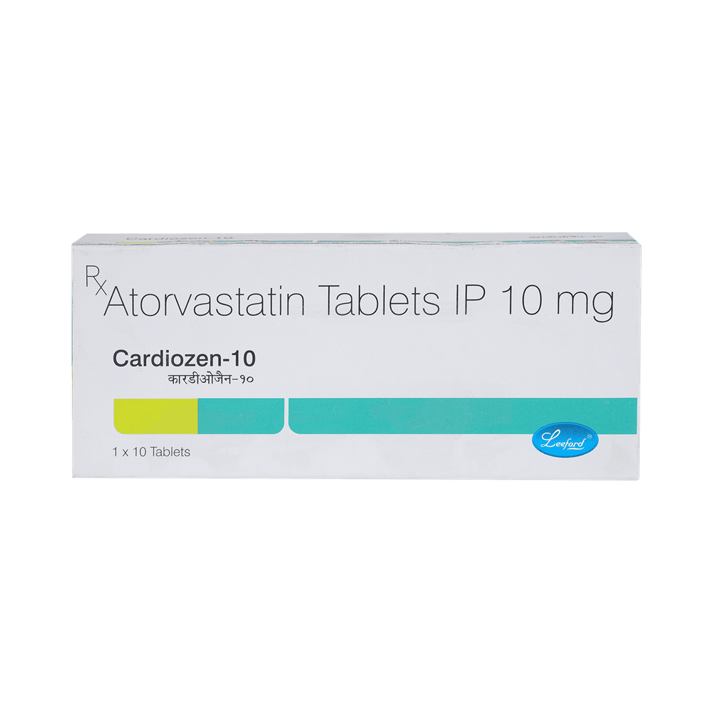 Cardiozen 10mg Tablet belongs to a group of medicines called statins. It is used to lower cholesterol and to reduce the risk of heart disease. Cholesterol is a fatty substance that builds up in your blood vessels and causes narrowing, which may lead to a heart attack or stroke. Cardiozen 10mg Tablet is a widely prescribed medicine and is regarded as safe for long-term use when taken as per the doctor's advice. It can be taken with a meal or on an empty stomach. You can take it at any time of the day, but try to take it at about the same time each day. Most people with high cholesterol do not feel ill, but stopping the medicine may increase cholesterol levels, thereby increasing the risk of heart disease and stroke.It is important to have your cholesterol levels checked regularly. This medicine is only one part of the treatment program, which should also include a healthy diet, regular exercise, smoking cessation, moderation of alcohol intake, and weight reduction. You can eat normally while taking this medicine, but try to avoid foods that are high in fat.Common side effects of this medicine include nausea, diarrhea, indigestion, muscle pain (on long-term use), and joint pain. These are usually mild and disappear after a short time. Consult your doctor if they persist or if you notice any yellowing of your eyes or get repeated or unexplained muscle pains.This medicine should not be used in some conditions, such as liver disease. Also, pregnant women and breastfeeding mothers should not take this medicine, as it may harm the developing baby. Diabetic patients should monitor their blood sugar levels while taking this medicine, as it may increase their blood sugar levels. Your doctor may check your liver function before starting the treatment and monitor it regularly thereafter.