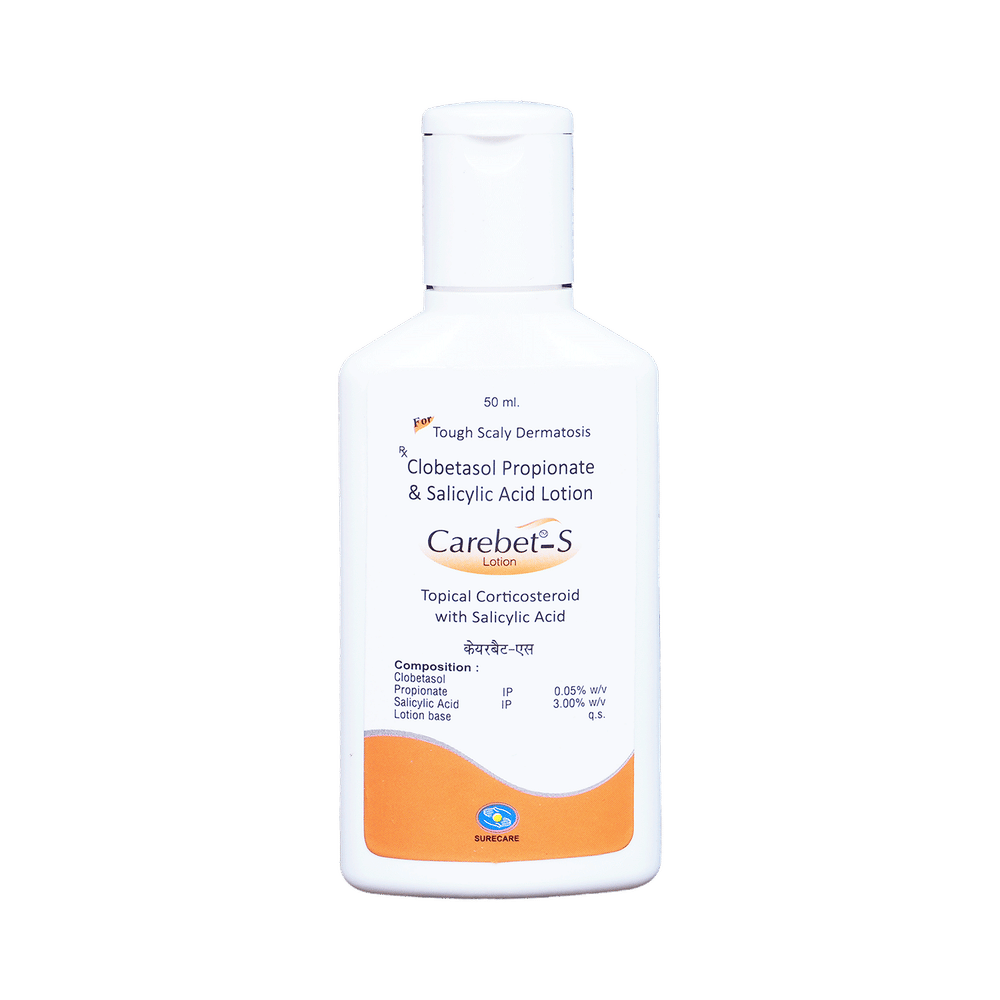 CAREbet- S Lotion is a combination of two medicines: Clobetasol and Salicylic Acid, which treats eczema and psoriasis. Clobetasol is a steroid which blocks the production of certain chemical messengers (prostaglandins) that make the skin red, swollen and itchy. Salicylic Acid is a keratolytic medicine which breaks down keratin clumps, removes dead skin cells and softens the skin. It also enhances the absorption of Clobetasol into the skin.