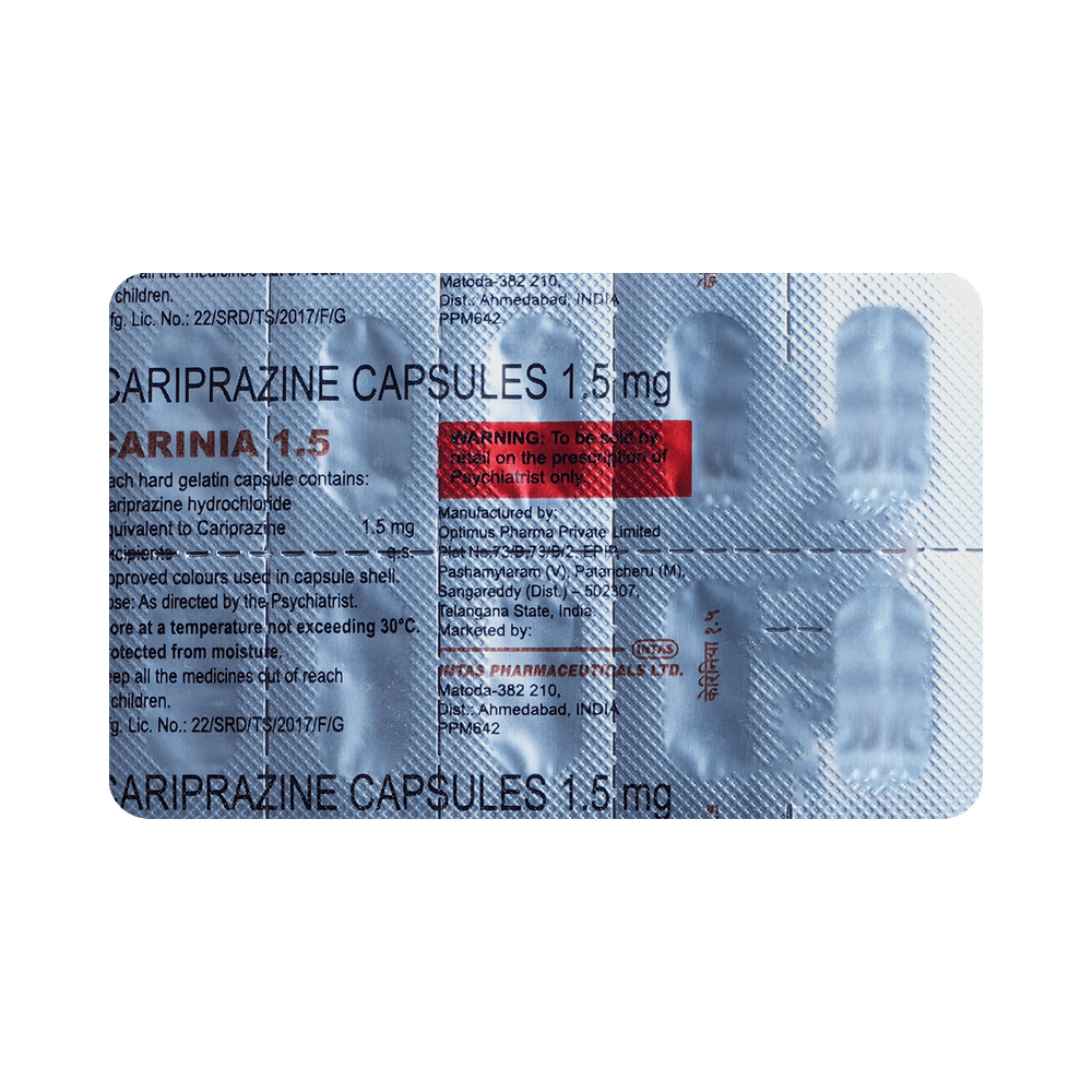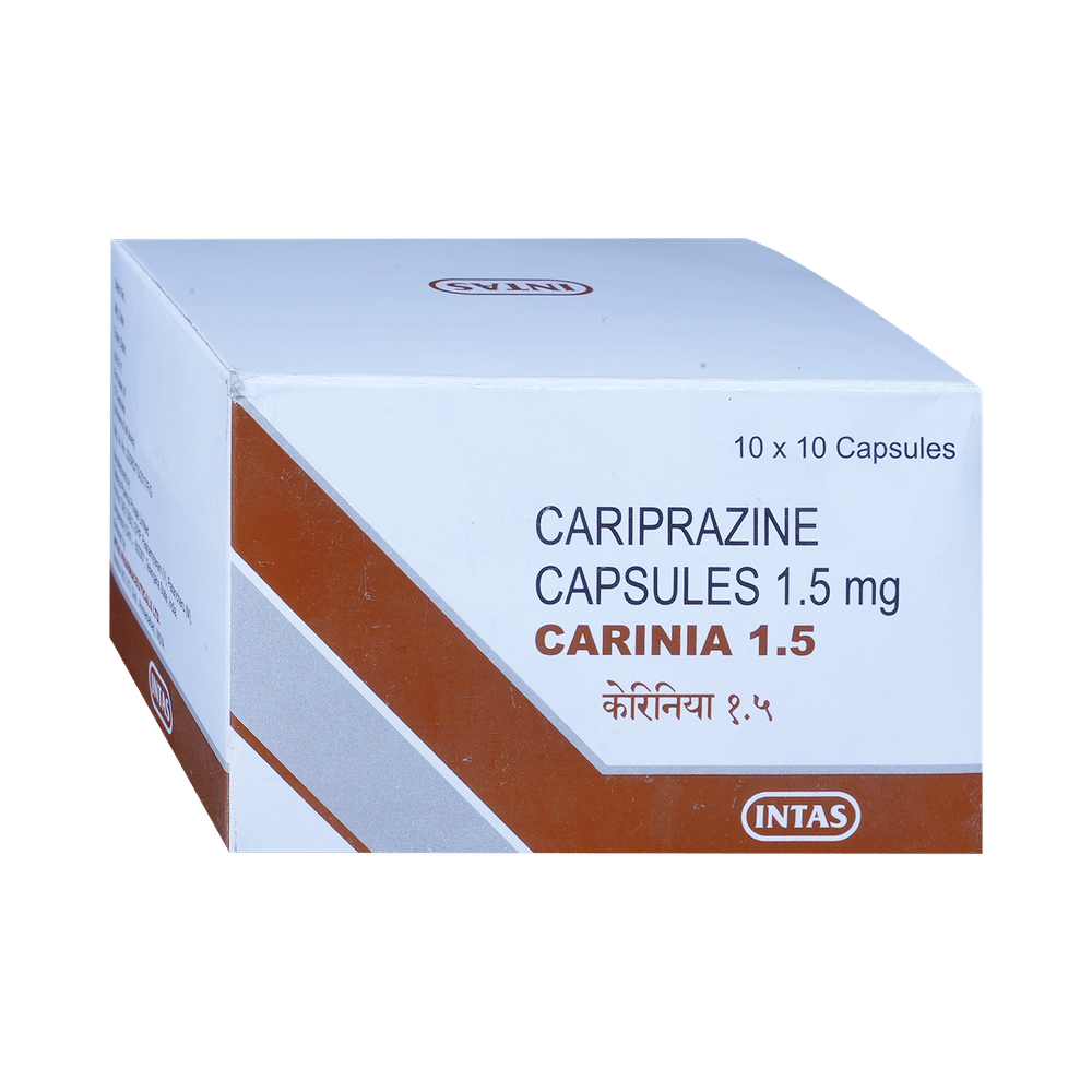 Carinia 1.5mg Capsule is used in the treatment of schizophrenia (a mental disorder that can result in hallucinations or delusions and also adversely affect a person’s ability to think and behave) and mania. It is also used to treat bipolar disorders. Carinia 1.5mg Capsule may be taken with or without food. However, it is advised to take it at the same time each day as this helps maintain a consistent level of medicine in the body. Take this in the dose and duration advised by your doctor, and if you have missed a dose, take it as soon as you remember. It is important that this medication is not stopped suddenly without talking to your doctor, as this may worsen your symptoms. However, discontinue this medicine immediately if you experience neuroleptic malignant syndrome (NMS), characterized by fever, muscle rigidity, and altered consciousness or seizures.Some common side effects of Carinia 1.5mg Capsule include extrapyramidal symptoms, akathisia, dyspepsia, vomiting, somnolence, and restlessness. Initially, this medicine may cause a sudden drop in blood pressure when you change positions, so it is better to rise slowly if you have been sitting or lying down. It also causes dizziness and sleepiness; therefore, do not drive or do anything that requires mental focus until you know how this medicine affects you. This medicine may increase your weight, but modifying your lifestyle by eating a healthy diet and exercising regularly can reduce this side effect.You should be cautious while using this medicine as it may increase the risk of developing diabetes, so it is better to monitor glucose regularly. Inform your doctor if you develop any unusual changes in mood or behavior, new or worsening depression, or suicidal thoughts while taking this medicine.