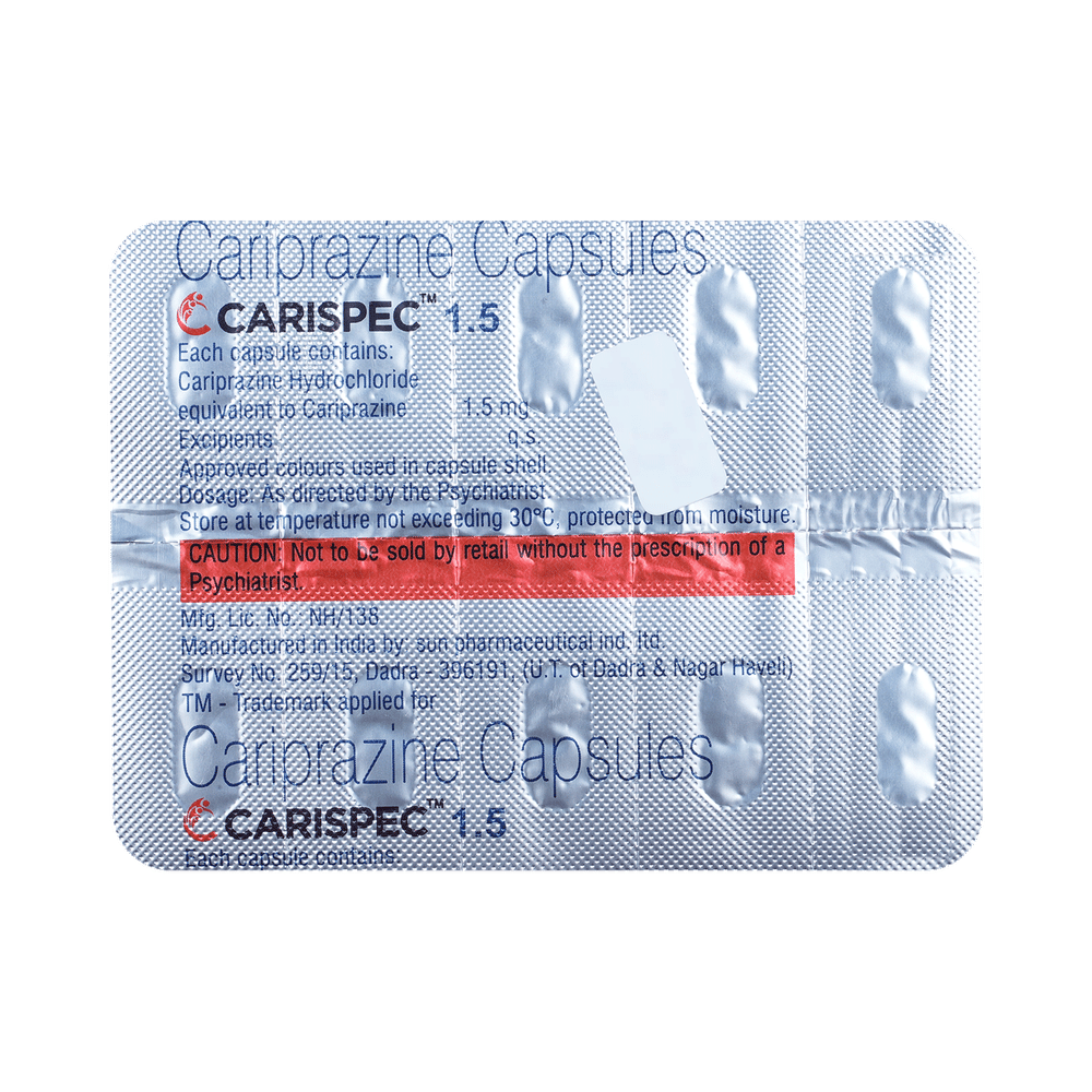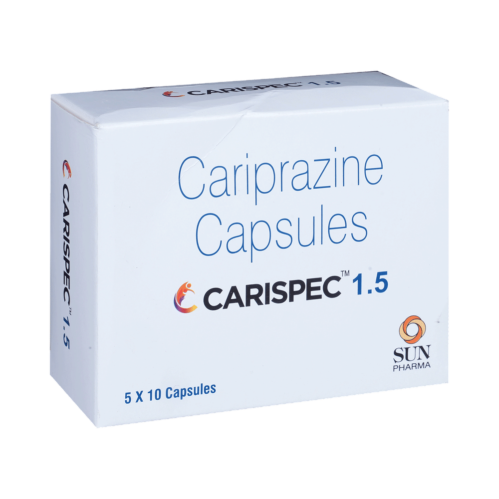 Carispec 1.5 Capsule is used in the treatment of schizophrenia (a mental disorder that can result in hallucinations or delusions and also adversely affect a person’s ability to think and behave) and mania. It is also used to treat bipolar disorders. Carispec 1.5 Capsule may be taken with or without food. However, it is advised to take it at the same time each day as this helps maintain a consistent level of medicine in the body. Take this in the dose and duration advised by your doctor, and if you have missed a dose, take it as soon as you remember. It is important that this medication is not stopped suddenly without talking to your doctor, as this may worsen your symptoms. However, discontinue this medicine immediately if you experience neuroleptic malignant syndrome (NMS), characterized by fever, muscle rigidity, and altered consciousness or seizures.Some common side effects of Carispec 1.5 Capsule include extrapyramidal symptoms, akathisia, dyspepsia, vomiting, somnolence, and restlessness. Initially, this medicine may cause a sudden drop in blood pressure when you change positions, so it is better to rise slowly if you have been sitting or lying down. It also causes dizziness and sleepiness; therefore, do not drive or do anything that requires mental focus until you know how this medicine affects you. This medicine may increase your weight, but modifying your lifestyle by eating a healthy diet and exercising regularly can reduce this side effect.You should be cautious while using this medicine as it may increase the risk of developing diabetes, so it is better to monitor glucose regularly. Inform your doctor if you develop any unusual changes in mood or behavior, new or worsening depression, or suicidal thoughts while taking this medicine.