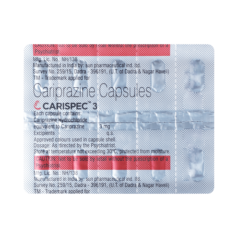 Carispec 3 Capsule is used in the treatment of schizophrenia (a mental disorder that can result in hallucinations or delusions and also adversely affect a person’s ability to think and behave) and mania. It is also used to treat bipolar disorders. Carispec 3 Capsule may be taken with or without food. However, it is advised to take it at the same time each day as this helps maintain a consistent level of medicine in the body. Take this in the dose and duration advised by your doctor, and if you have missed a dose, take it as soon as you remember. It is important that this medication is not stopped suddenly without talking to your doctor, as this may worsen your symptoms. However, discontinue this medicine immediately if you experience neuroleptic malignant syndrome (NMS), characterized by fever, muscle rigidity, and altered consciousness or seizures.Some common side effects of Carispec 3 Capsule include extrapyramidal symptoms, akathisia, dyspepsia, vomiting, somnolence, and restlessness. Initially, this medicine may cause a sudden drop in blood pressure when you change positions, so it is better to rise slowly if you have been sitting or lying down. It also causes dizziness and sleepiness; therefore, do not drive or do anything that requires mental focus until you know how this medicine affects you. This medicine may increase your weight, but modifying your lifestyle by eating a healthy diet and exercising regularly can reduce this side effect.You should be cautious while using this medicine as it may increase the risk of developing diabetes, so it is better to monitor glucose regularly. Inform your doctor if you develop any unusual changes in mood or behavior, new or worsening depression, or suicidal thoughts while taking this medicine.