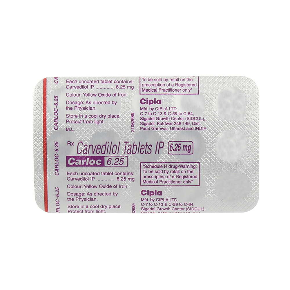 Carloc 6.25 Tablet is a medicine used to treat high blood pressure, heart-related chest pain (angina), and heart failure. It works by relaxing the blood vessels, so that blood can flow more easily to the heart. Lowering blood pressure also helps prevent future heart attacks and strokes. Carloc 6.25 Tablet should be taken with food. You should take it in the dose and duration as advised by the doctor. It is important to take it even if you feel well or your blood pressure is controlled. Do not stop this medicine without talking to the doctor, as your condition could get worse.Making some changes in your lifestyle will help improve your condition. These may include regular exercise, losing weight, smoking cessation, reducing alcohol intake, and reducing the amount of salt in your diet as advised by your doctor.This medicine is tolerated well by most patients, but it may have a few side effects. These include dizziness, headache, breathlessness, and tiredness. Let your doctor know if these side effects bother you or do not go away.Before taking this medicine, let your doctor know if you have any heart or kidney diseases. Pregnant or breastfeeding mothers should also consult their doctor before taking this medicine.