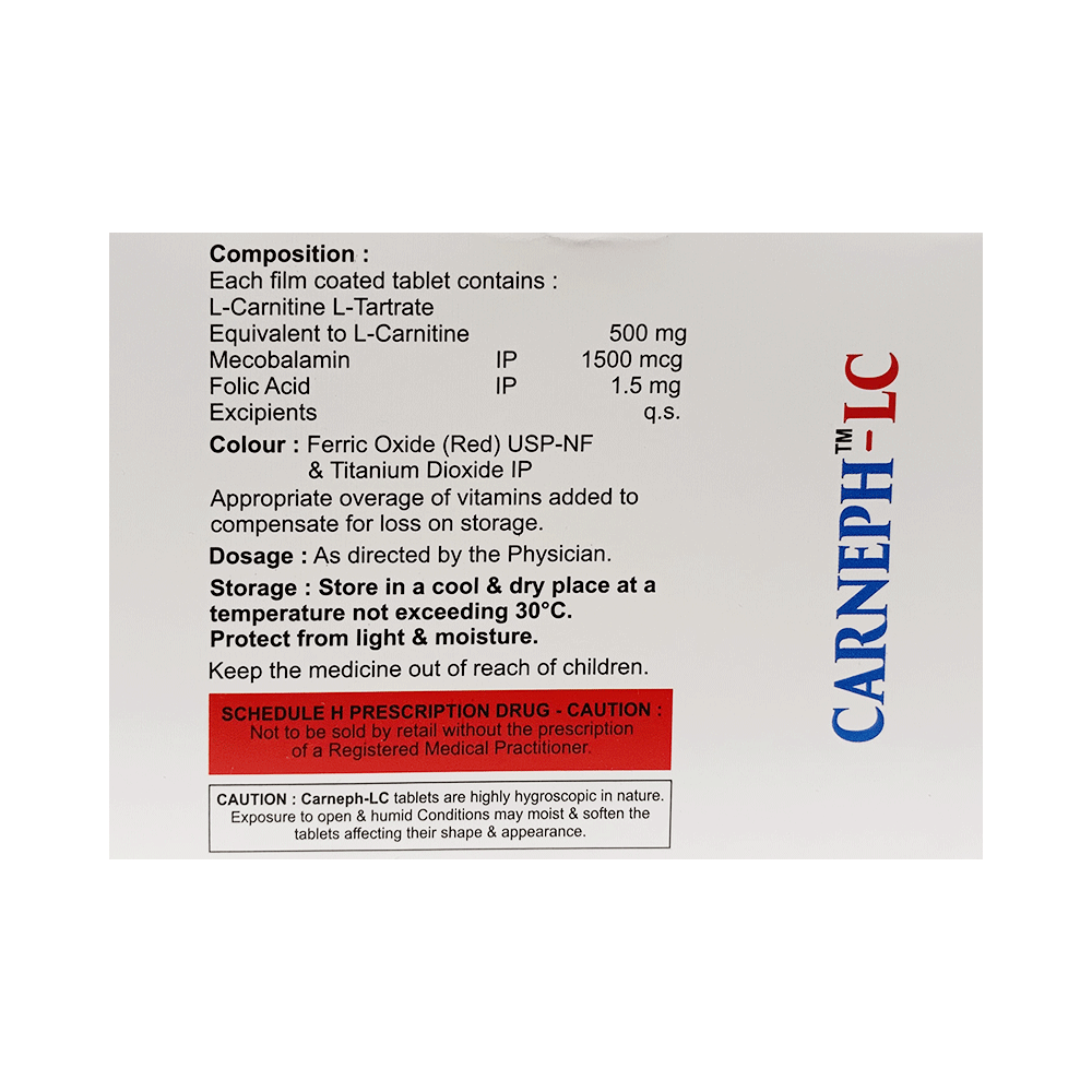 Carneph-LC Tablet is a combination of vitamin B9, B12, L-carnitine L-tartrate. Folic acid is essential for production of red blood cells. It prevents and treats folate deficiency and anemia. When taken by pregnant women, Folic acid prevents miscarriage, preterm labor, and neural tube defects in infants. Levo-carnitine L-tartrate helps turn the fats present in ingested food into energy. It decreases insulin resistance and oxidative stress and improves immune function. Methylcobalamin corrects vitamin B12 deficiency thereby helping in treating certain anemias and nerve problems.