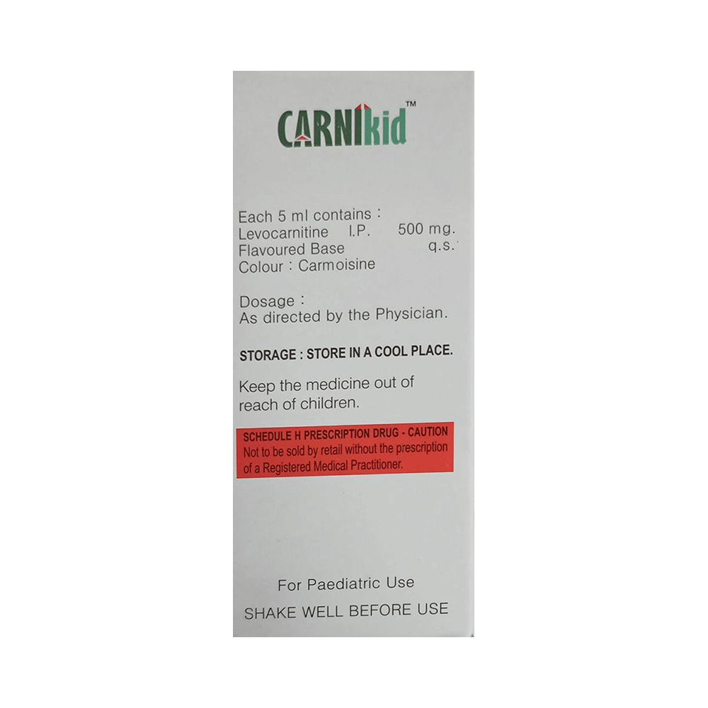Carnikid Oral Solution Sugar Free belongs to a class of medications called amino acids. It is used in the treatment of carnitine deficiency. It helps the body produce energy and improve the efficiency of body function. Carnikid Oral Solution Sugar Free should be taken with food and it should be chewed thoroughly before swallowing. Take it in the dose and duration as advised by your doctor. Do not start or stop taking this medicine without a doctor's prescription.Carnikid Oral Solution Sugar Free is usually a safe medicine, however, it may cause nausea and vomiting. Your doctor may suggest you to monitor your blood glucose levels regularly while you are taking the medicine.Before starting the medicine, inform your doctor if you have any other medical conditions or are taking any other medications. Patients with severe kidney disease should not take this medicine unless prescribed by the doctor.