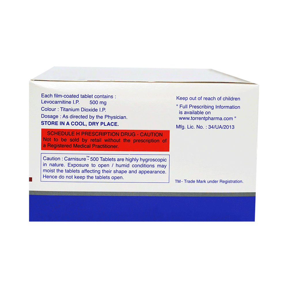 In Carnitine deficiencyCarnitine deficiency can lead to many problems such as muscle weakness, fatigue, problems with heart (such as heart enlargement), liver or brain (encephalopathy), confusion etc. Carnisure 500 Tablet contains amino acids that are very important for the normal growth and development of the internal organs, muscles and nerves. It helps to maintain normal functioning of the internal organs and maintains nerve conduction too. It has a major role in the generation of energy in our body, regulation of mood, healing and repair of damaged tissues and keeping our skin, nails and hair healthy. Keep taking it as prescribed by the doctor to get the maximum benefit.